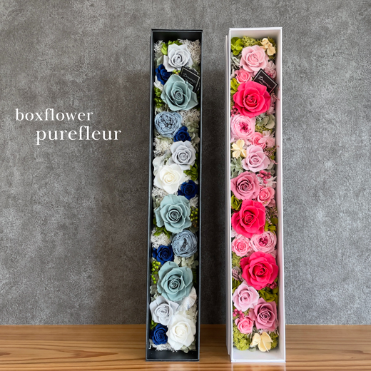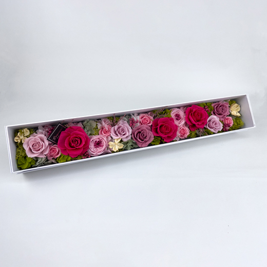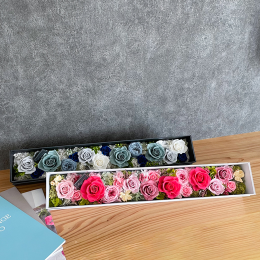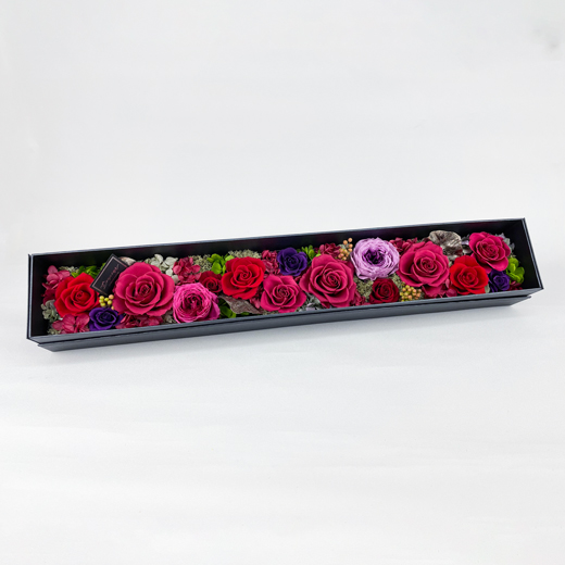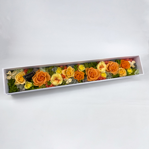 ひとつひとつ手作業でお花を選び、丁寧に作られたブリザーブドフラワー。クロス調でスタイリッシュなロングボックスに鮮やかなカラーのお花を使用しており、インテリアフラワーとしてどこに飾っても美しく存在感を放ちます。日頃の感謝の気持ちを、特別なフラワーギフトで伝えませんか?
