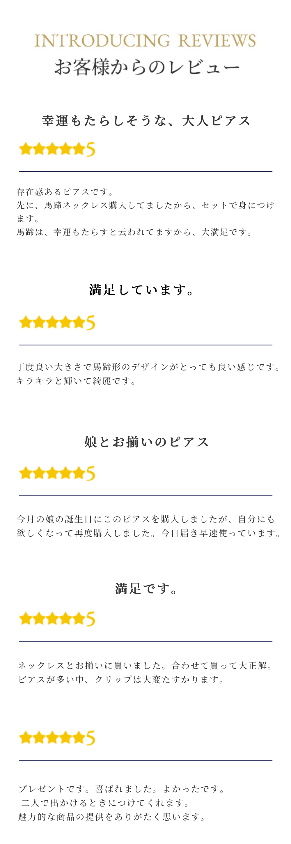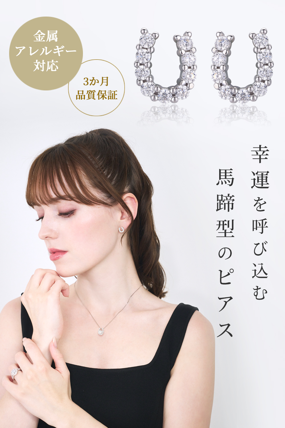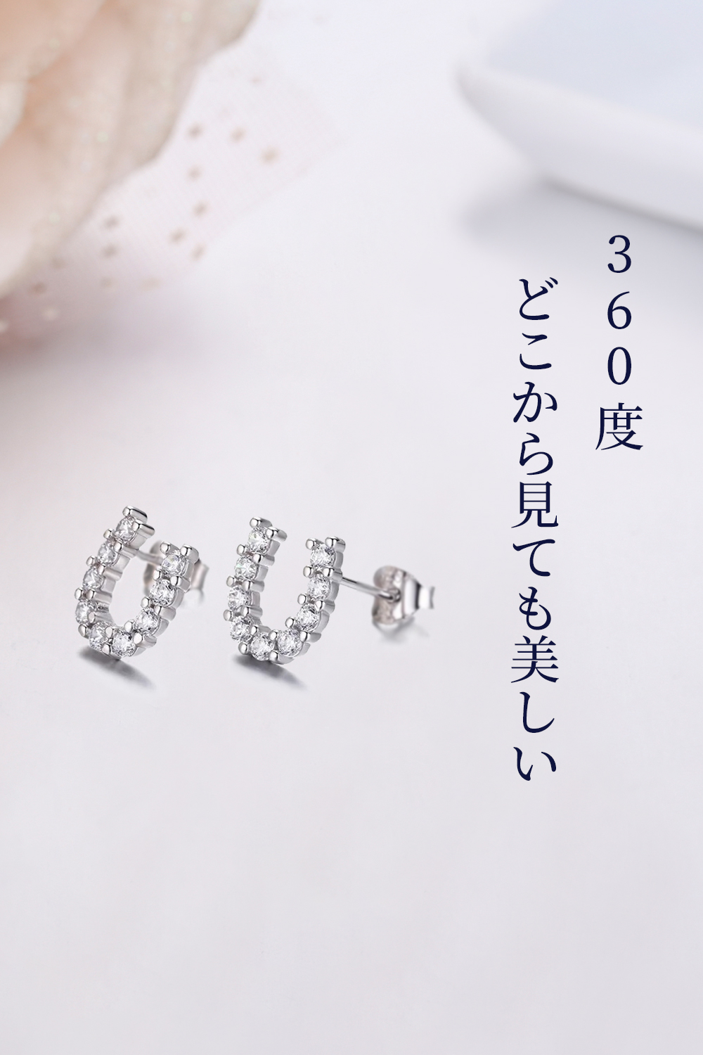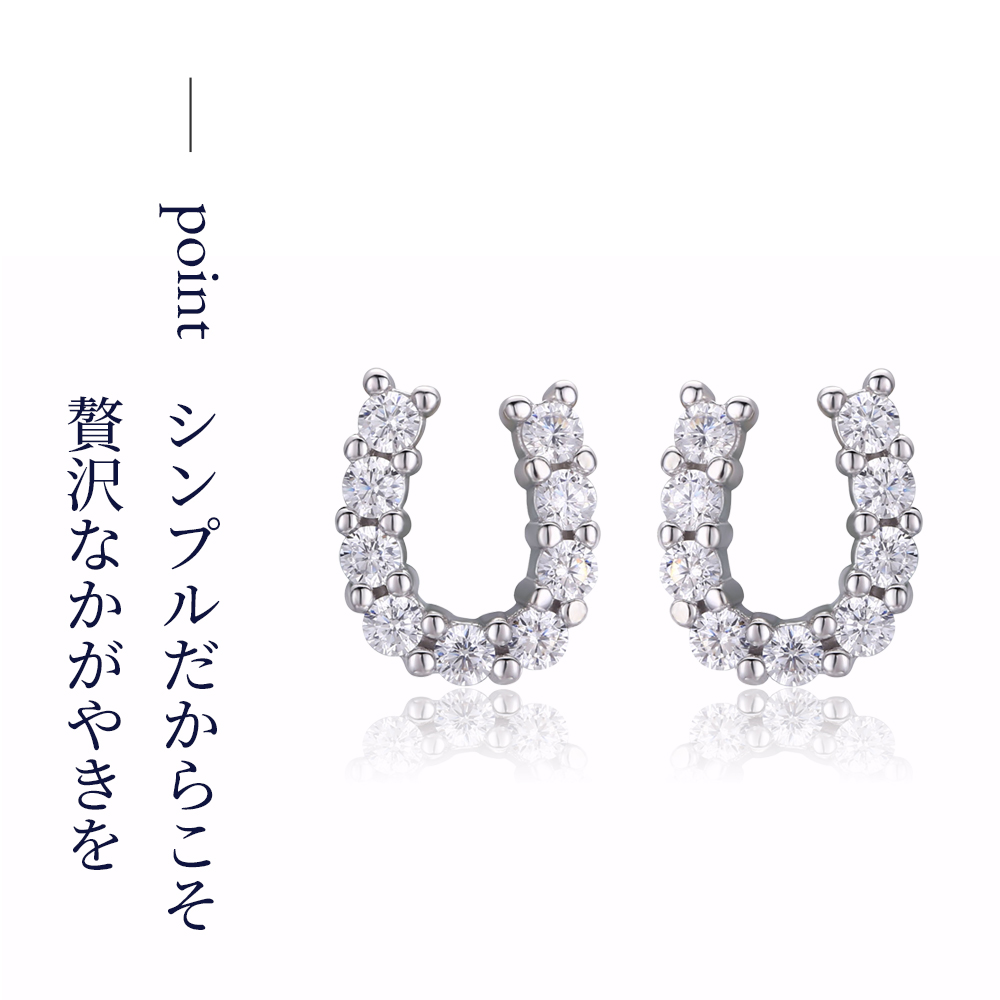 数百万円のダイヤにも劣らない輝きの最高級CZダイヤモンドを惜しみなく使い、ハイブランドのお洋服に負けないクオリティとセンスを低価格でお届けいたします。形といい、大きさといい、その高級感といい、他の馬蹄形ピアスとは一線を画す一品です。清楚なデザインがオフィスではもちろん、卒園式や入学式などのきちんと感のある装いにも最適。