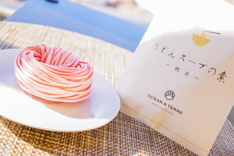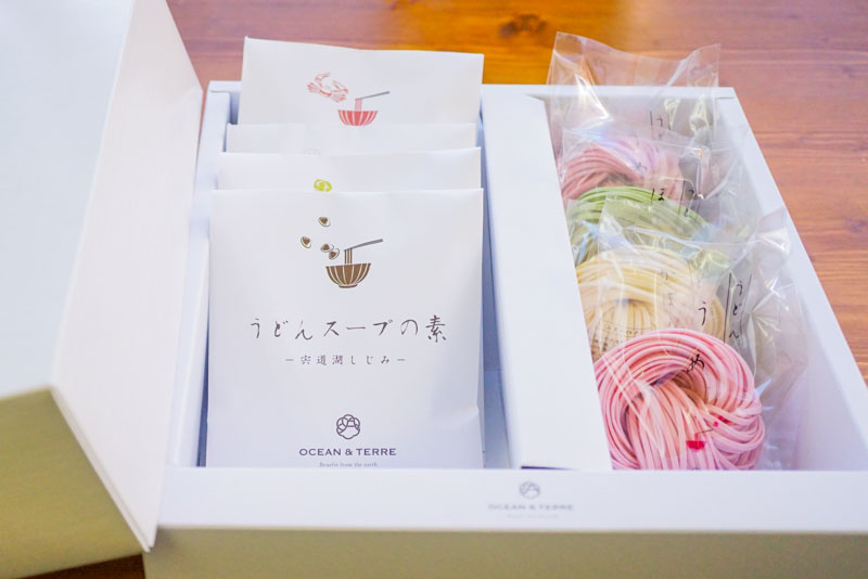 大地の恵みと海の幸を一度に感じられるうどん。 お家ではなかなか作れない本格派です。 うどんは野菜を練りこんでいるので、見た目も鮮やか。縁起物として大切な方への贈り物や、日頃の感謝を伝えるのにもピッタリです。