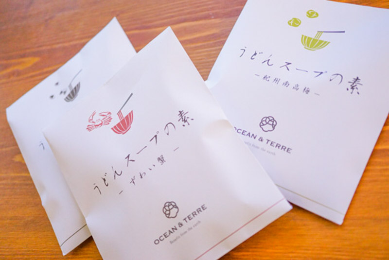 野菜を麺に練りこんだうどんと、北海道産昆布と枕崎産かつお節と九州産のさば節で海の風味を利かせただしスープです。大地の恵みと海の幸が口の中に広がる、心にもカラダにもやさしい味の、うどんのセットをご用意しました。味は麺はほうれん草、かぼちゃ、梅の3種類、スープはずわい蟹、帆立、紀州南高梅、宍道湖しじみの4種類です。本格的な薬味もセットです。
