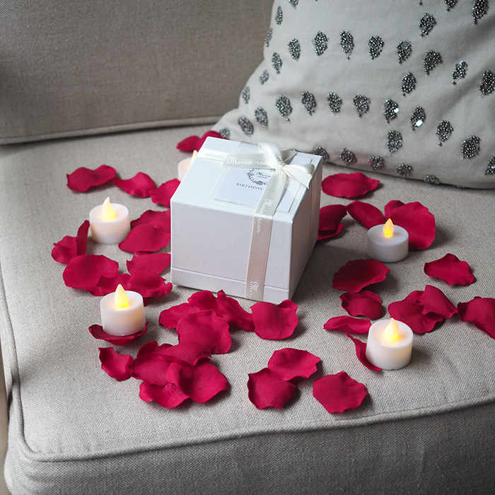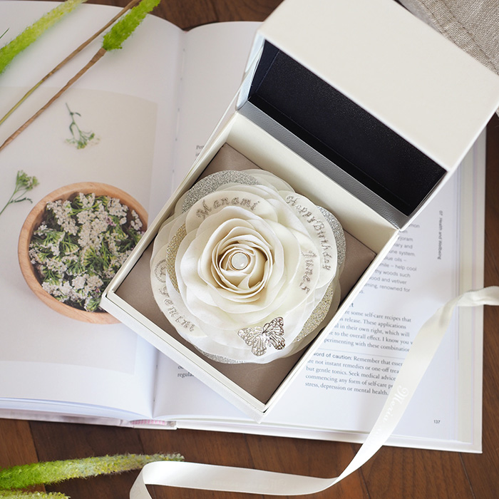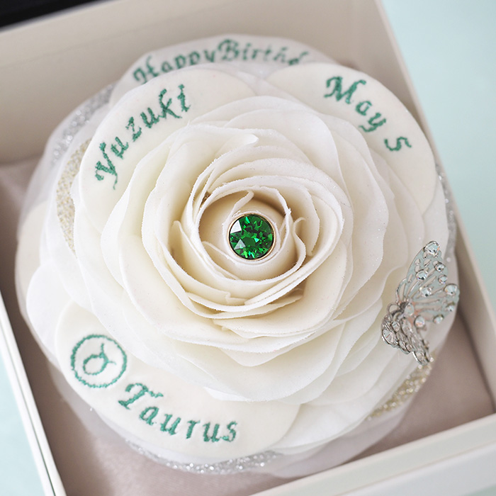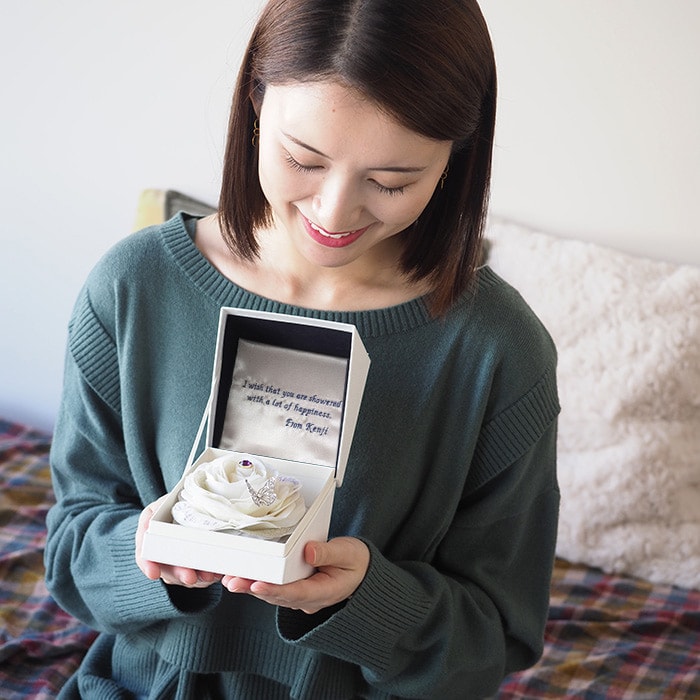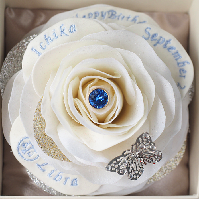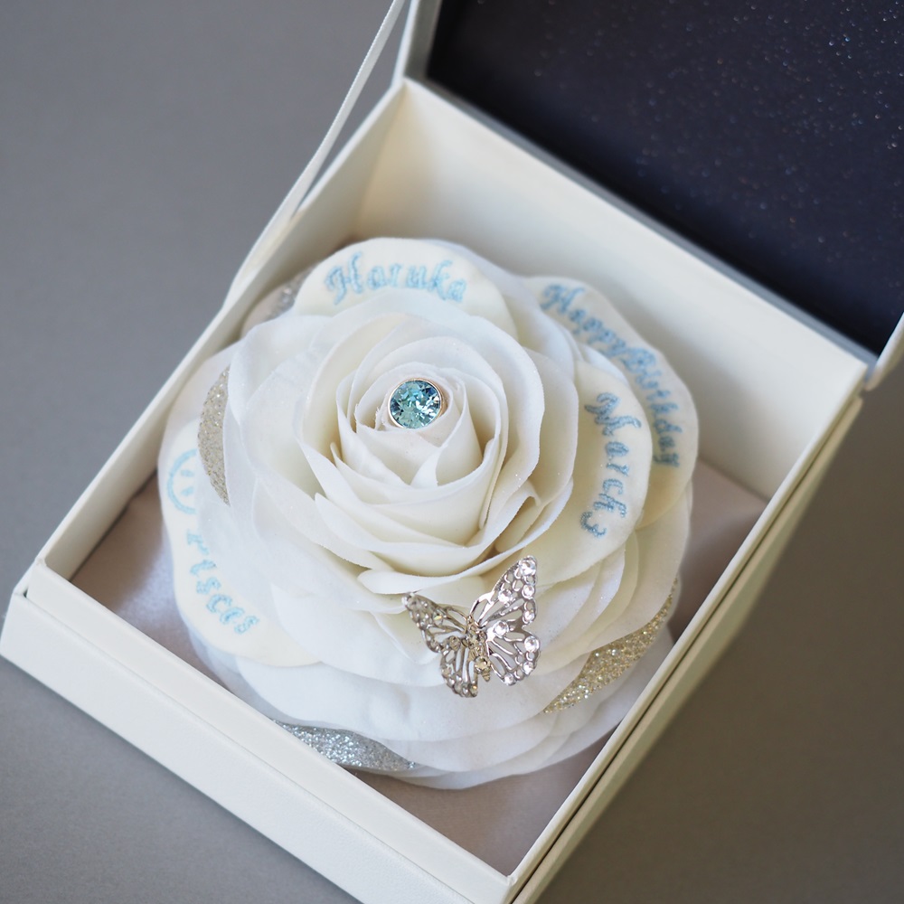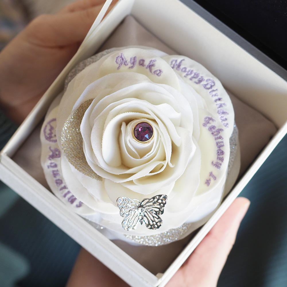バラ・誕生石・刺繍が美しく見えるように斜めに角度をつけて設計したオリジナルボックスは、贈った後そのまま飾ることが出来ます。