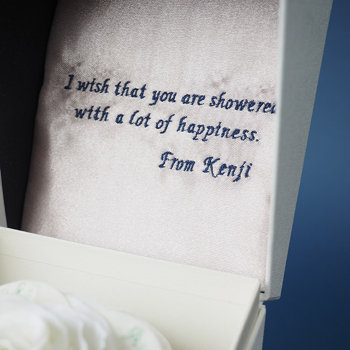 本商品のボックス内側に、「I wish that you are showered with a lot of happiness.from〇〇(たくさんの幸せが降り注ぎますように)」のメッセージを刺繍することができます。※【From ○○】に贈り主様の名前が入ります。