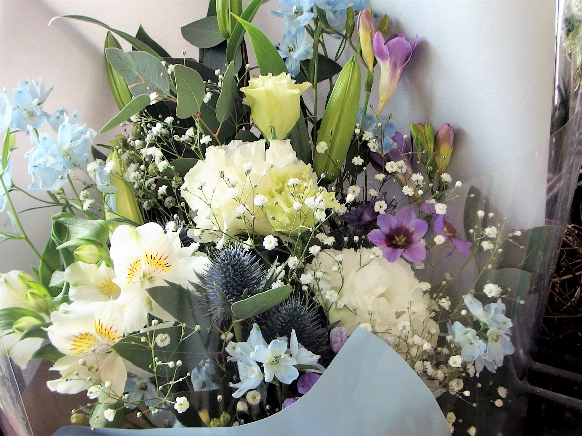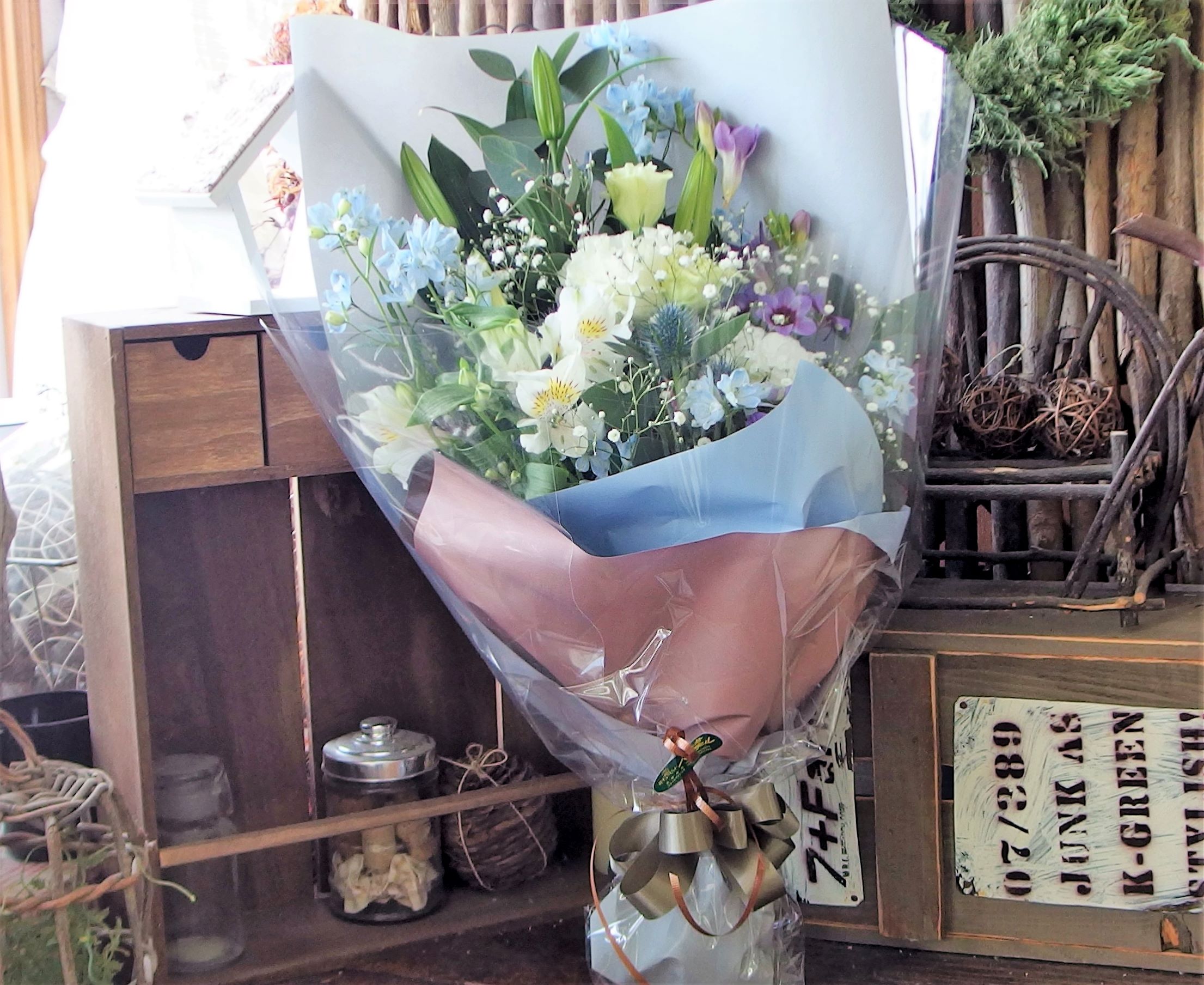 大口注文・法人のお問い合わせはこちらブルー系のお花を使用してかっこよくお作りします。ユリが入っているためボリュームがあり、渡し映えのする花束です。