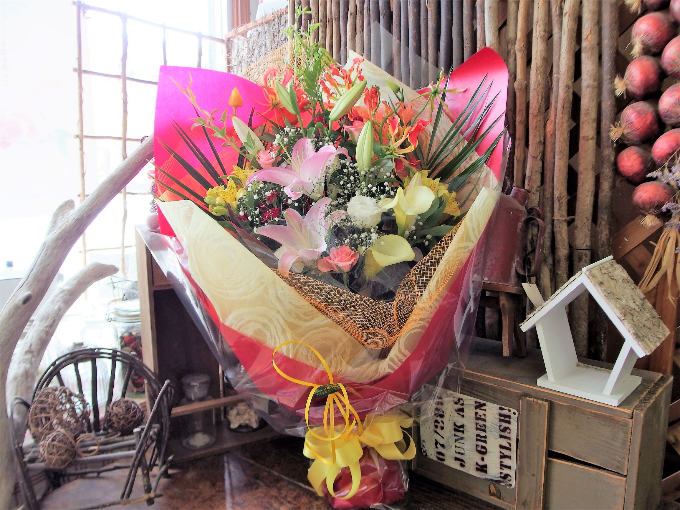 フランス語で花壇という意味の「パルテール(Parterre)」がお届けする、「退職祝にもおすすめ豪華なお花」です。大きなピンクのユリがとってもゴージャスな印象ですね。レッドやイエローなど色鮮やかなアレンジメントとラッピングは、退職のお祝いにもぴったりな花束です。