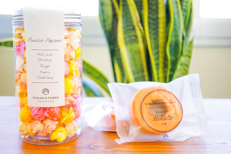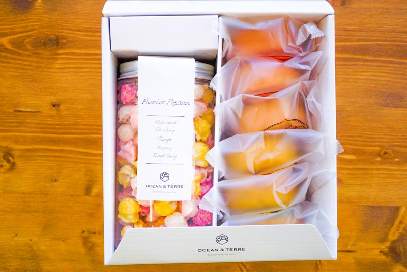 カリッとした食感でピンク、黄色、緑などカラフルなポップコーン。 栃木県産のとちおとめ苺、山形県産のさくらんぼ、山梨県産の白桃 北海道産の赤肉メロン、沖縄県産のマンゴー、山形県産のラ・フランス の6種のフルーツバーム。 それぞれオシャレで美味しいセットになっています。