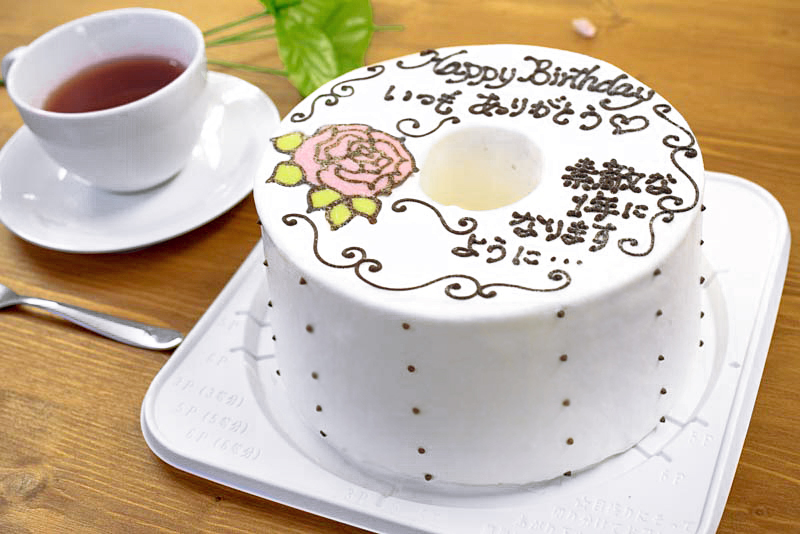 バニラビーンズが香る生クリームでコーティングした無添加シフォンケーキの上に、お好きなメッセージを入れたオリジナルケーキをお作りします。とろける食感が自慢の当店看板商品「王様のシフォンケーキ」のプレーンタイプを使用。誕生日や記念日など、温かな思いを伝える特別な日の贈り物に最適です。