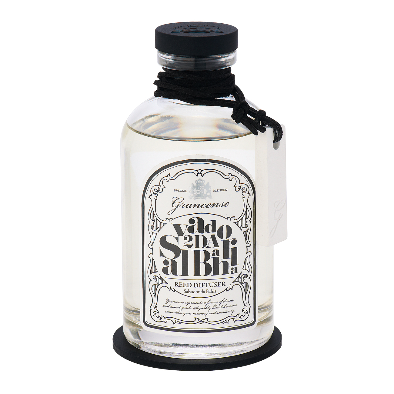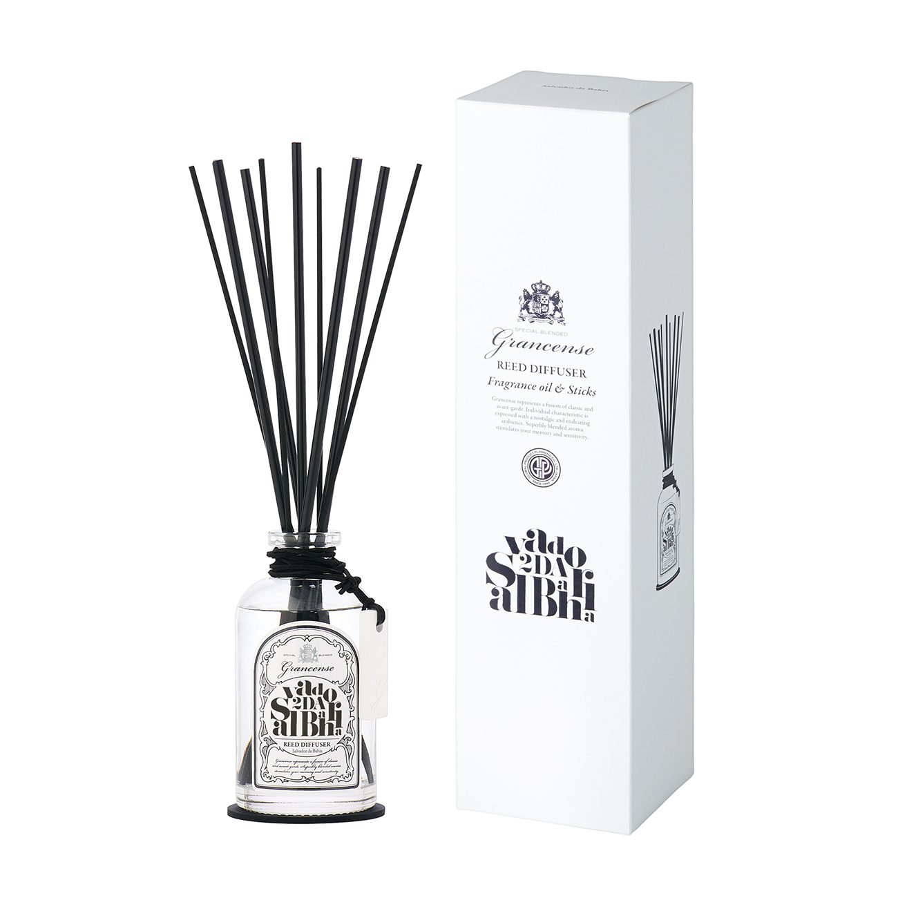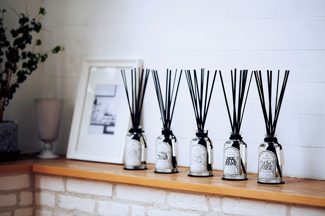 魅惑のフレグランスシリーズ「grancense(グランセンス)」。重厚感のあるガラスボトルは、太さ違いで組み合せた専用スティックを挿すことで存在感のあるインテリアになります。ガラスボトルについたチャームは珪藻土と石膏で作られており、使用後にはボトルから外してアロマオイル等を垂らせば引き続き香りを楽しむこともできます。