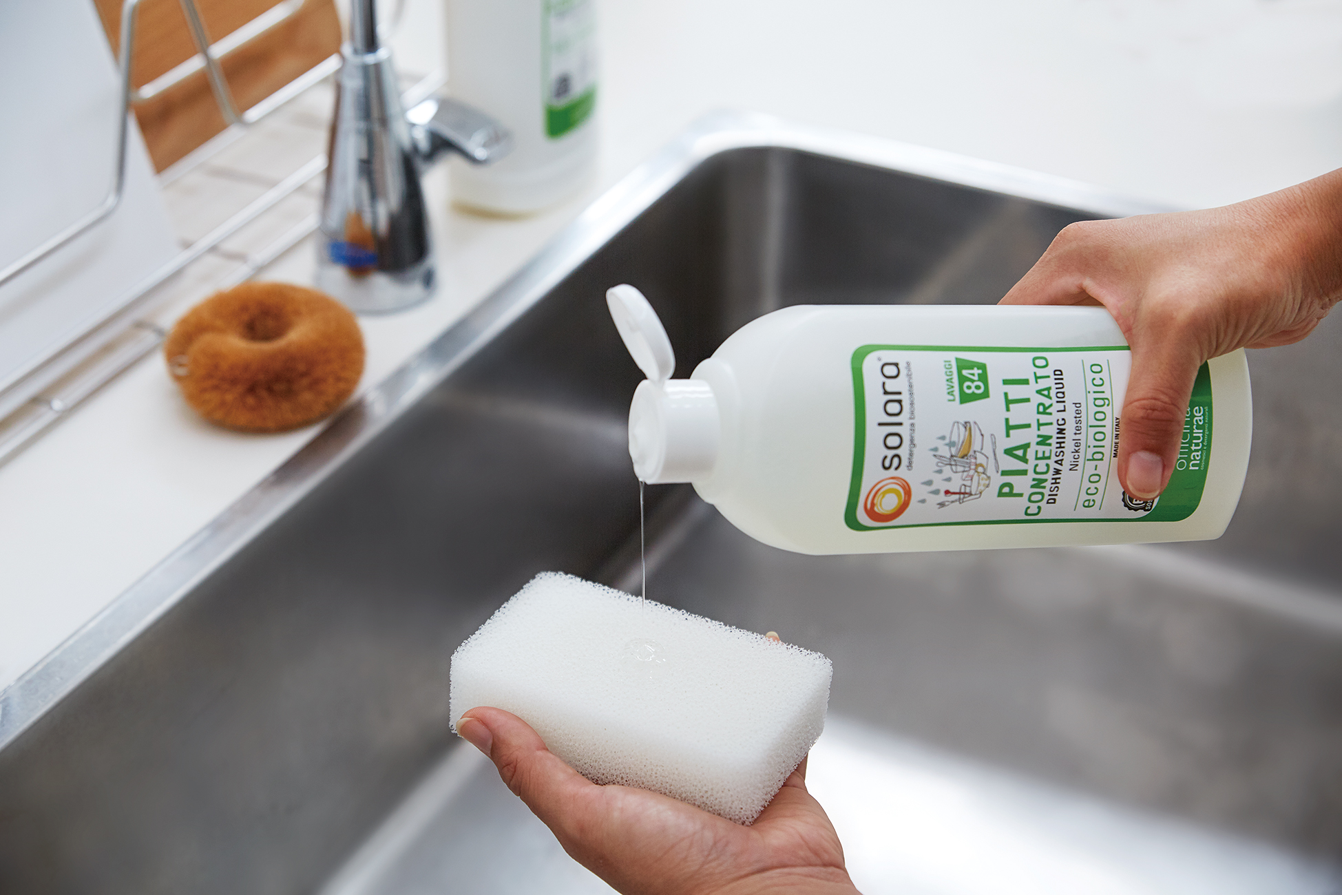 大口注文・法人のお問い合わせはこちら独自の植物由来洗浄成分と酸素のチカラで洗う食器用洗剤です。イタリア産オーガニックナタネ油由来の洗浄成分を使用しているので油汚がれすっきり落ちて、泡切れも良いのが魅力です。洗い流した後は生分解され自然に還ります。