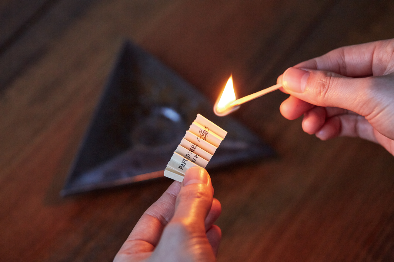 点線に沿って一枚切り離し、アコーディオン型に折ります。不燃性の容器の上に置き、ゆっくり燃えるように火をつけます。煙が上がるとともにお部屋の空気を浄化し、消臭します。