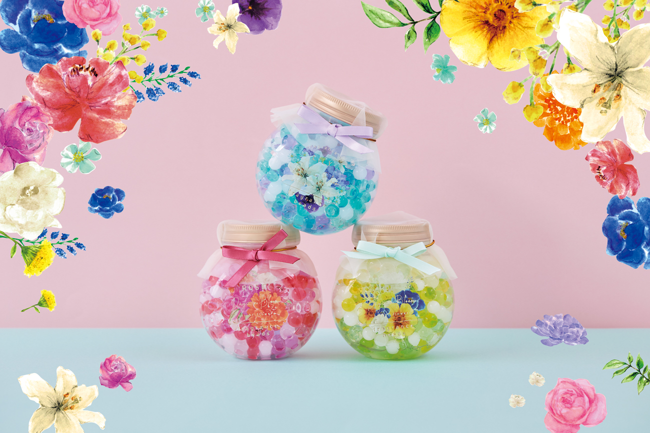 大口注文・法人のお問い合わせはこちらコロンとしたフォルムが可愛いオリジナル容器に入った、フレグランスビーズです。中に入っているビースもカラフルな色で、華やかなお部屋を演出します。ボトルには香りをイメージしたお花のデザインが描かれていて、華やかなものを好む女性に人気です。