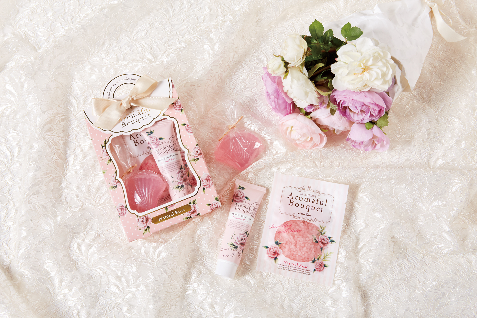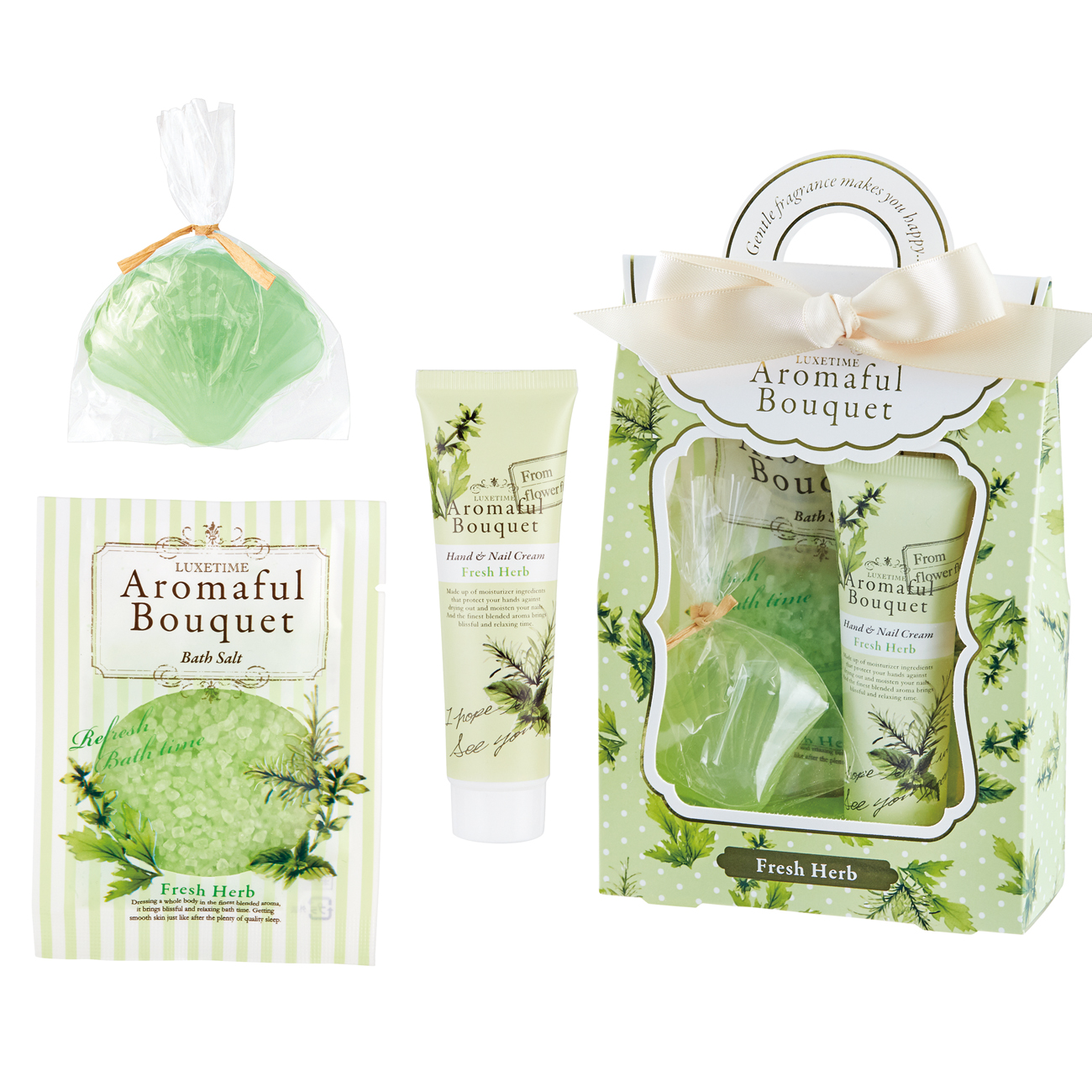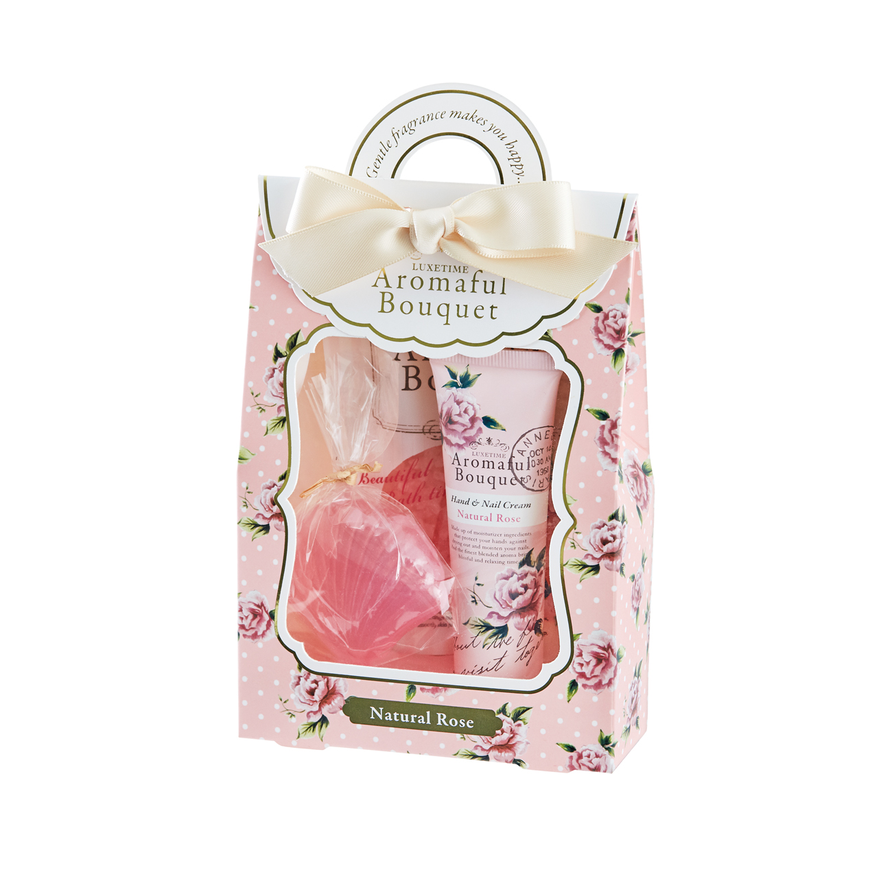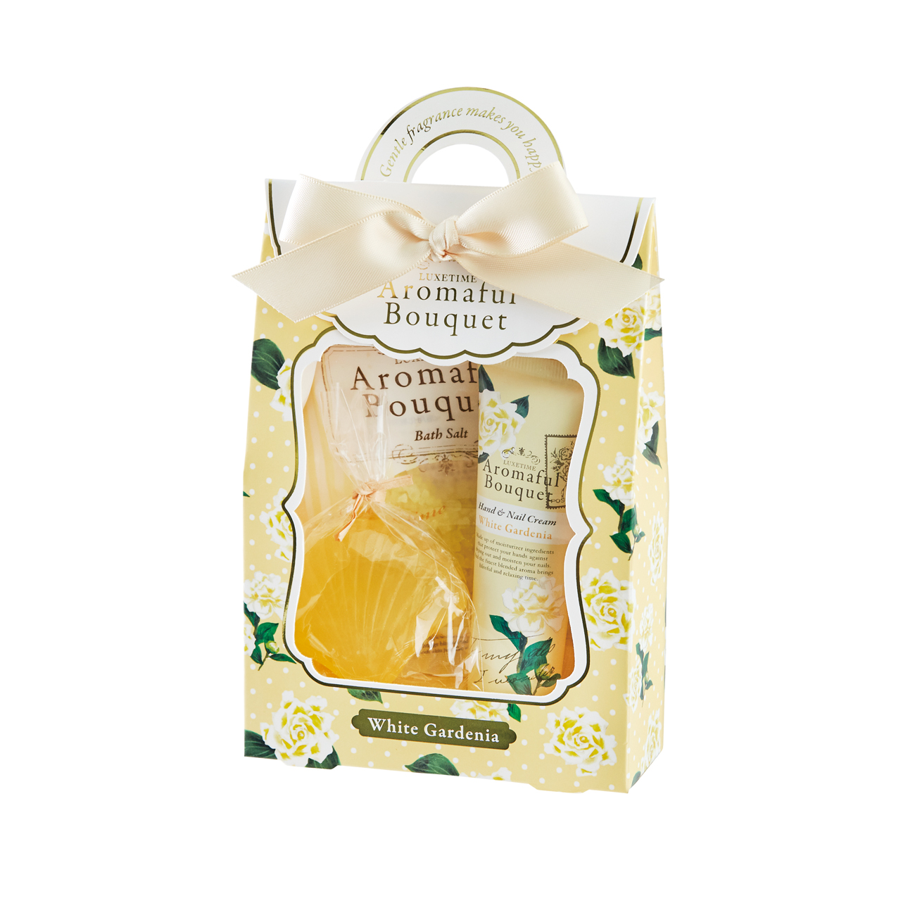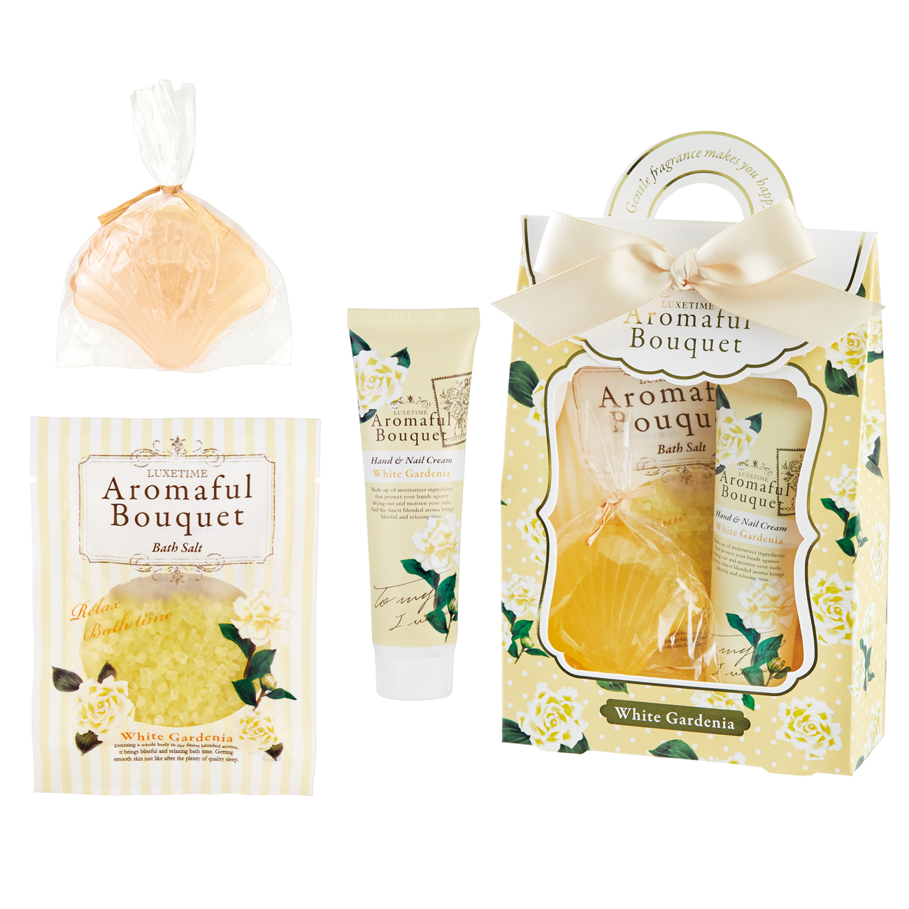 ブレンドにこだわった上質なアロマと優しく上品な雰囲気のデザインが魅力のAromaful Bouquet(アロマフルブーケ)のプチギフト。バスソルト、ゲストソープ、ハンド&ネイルクリームがセットになった贅沢なセットです。3種類の豊かなアロマの香りが楽しめます。