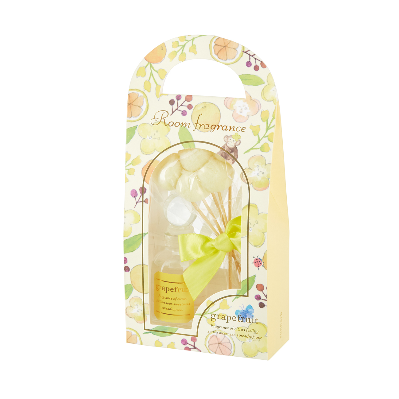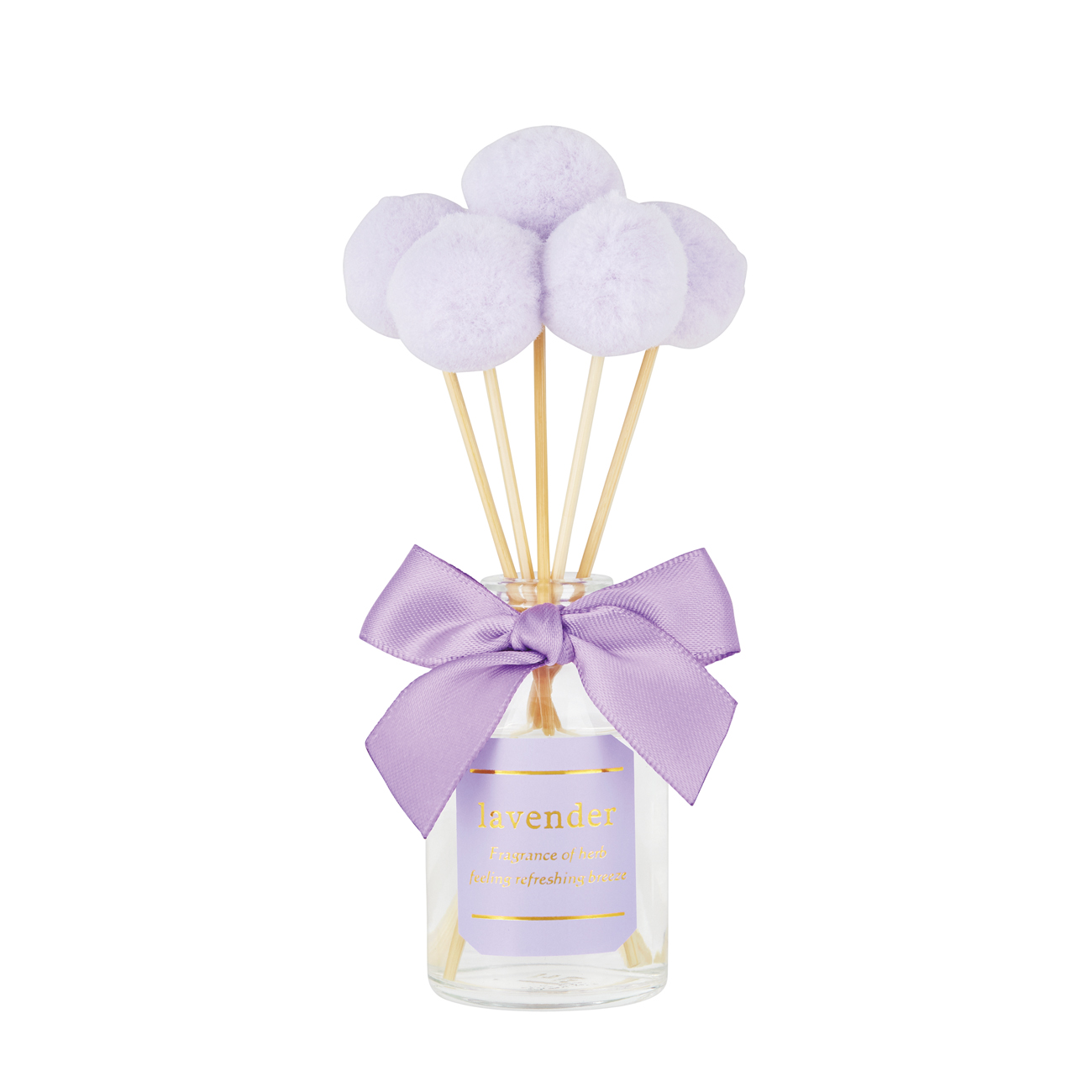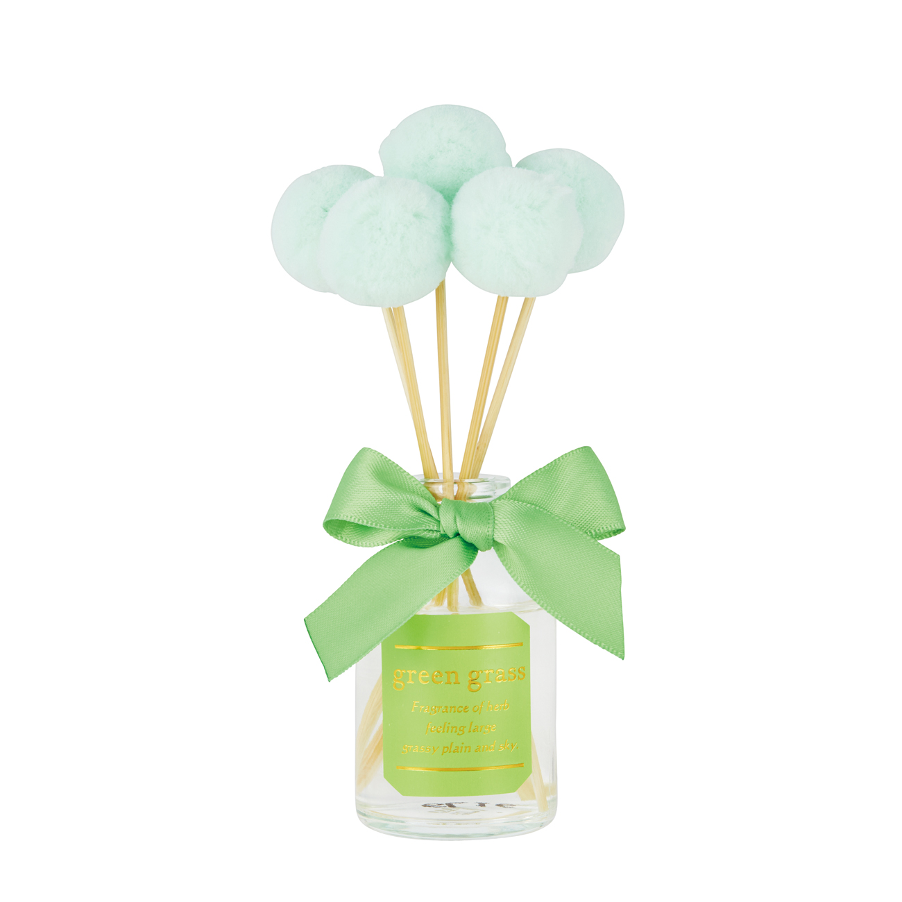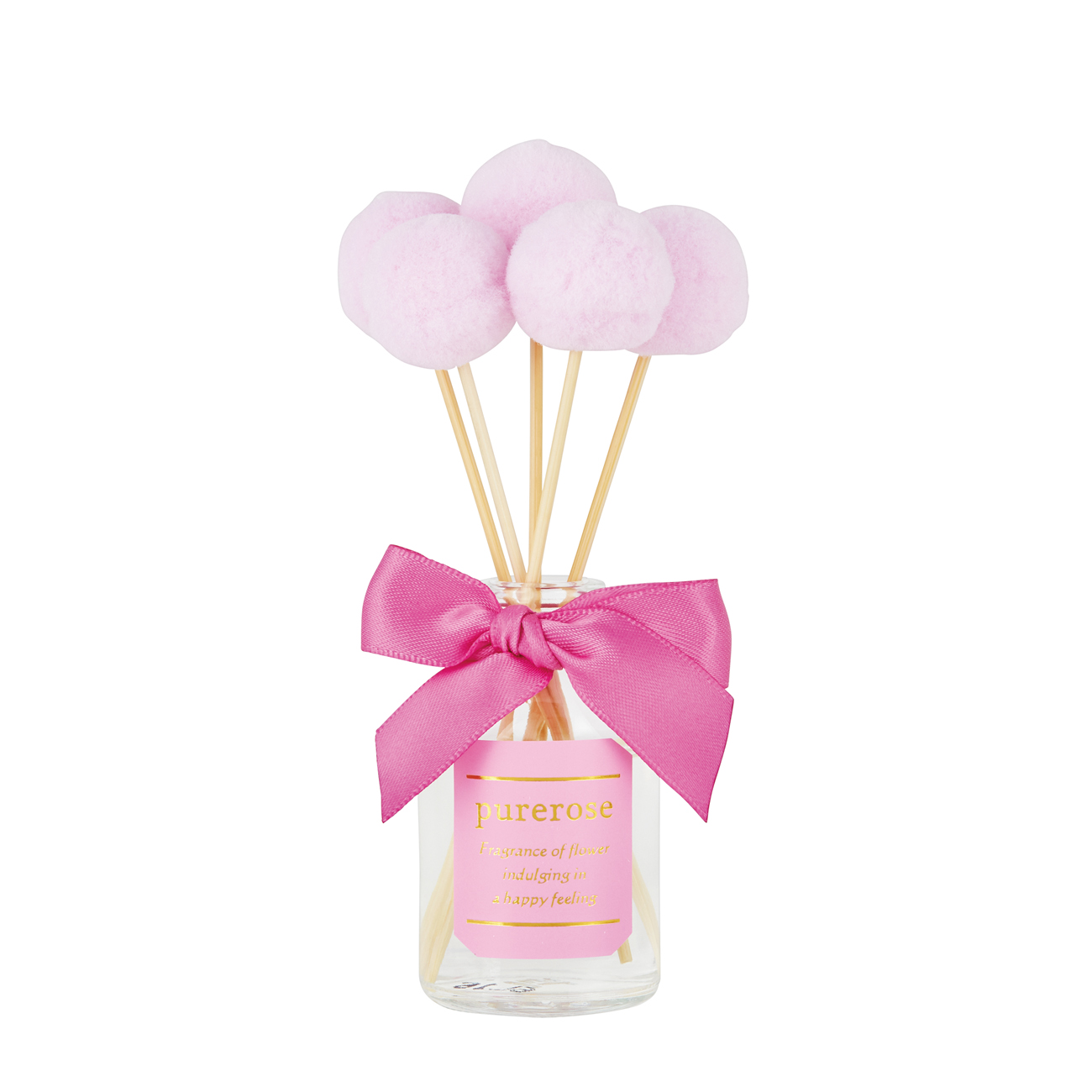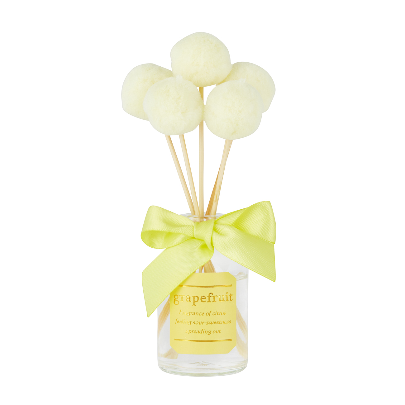 大口注文・法人のお問い合わせはこちらスティックの先にふわふわのポンポンが付いたルームフレグランスです。香りのイメージカラーと同じ色のリボンがとても可愛らしいですね。コンパクトなサイズなので置き場所を選ばず、玄関やトイレのアクセントになります。