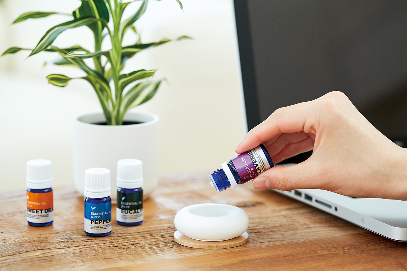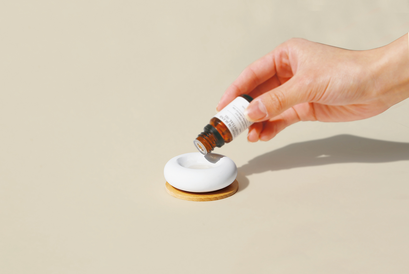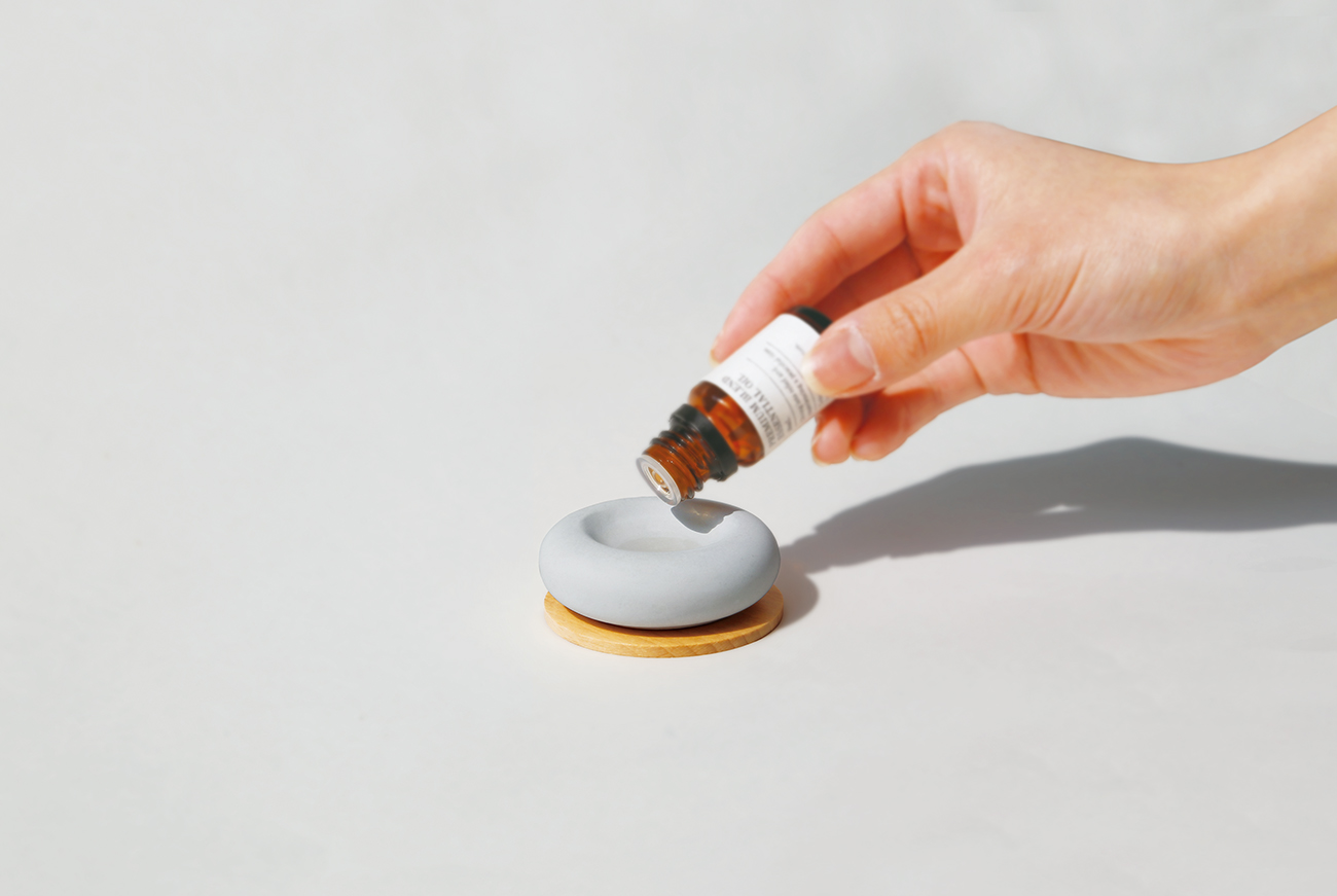 本体を付属のコースターに置き、中央のくぼみにエッセンシャルオイルやアロマオイルを直接2~5滴垂らし、香りをお楽しみください。