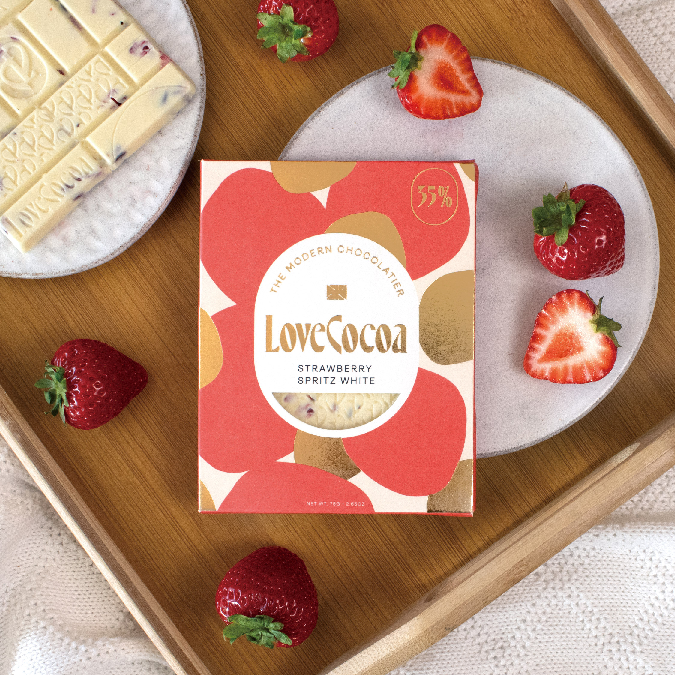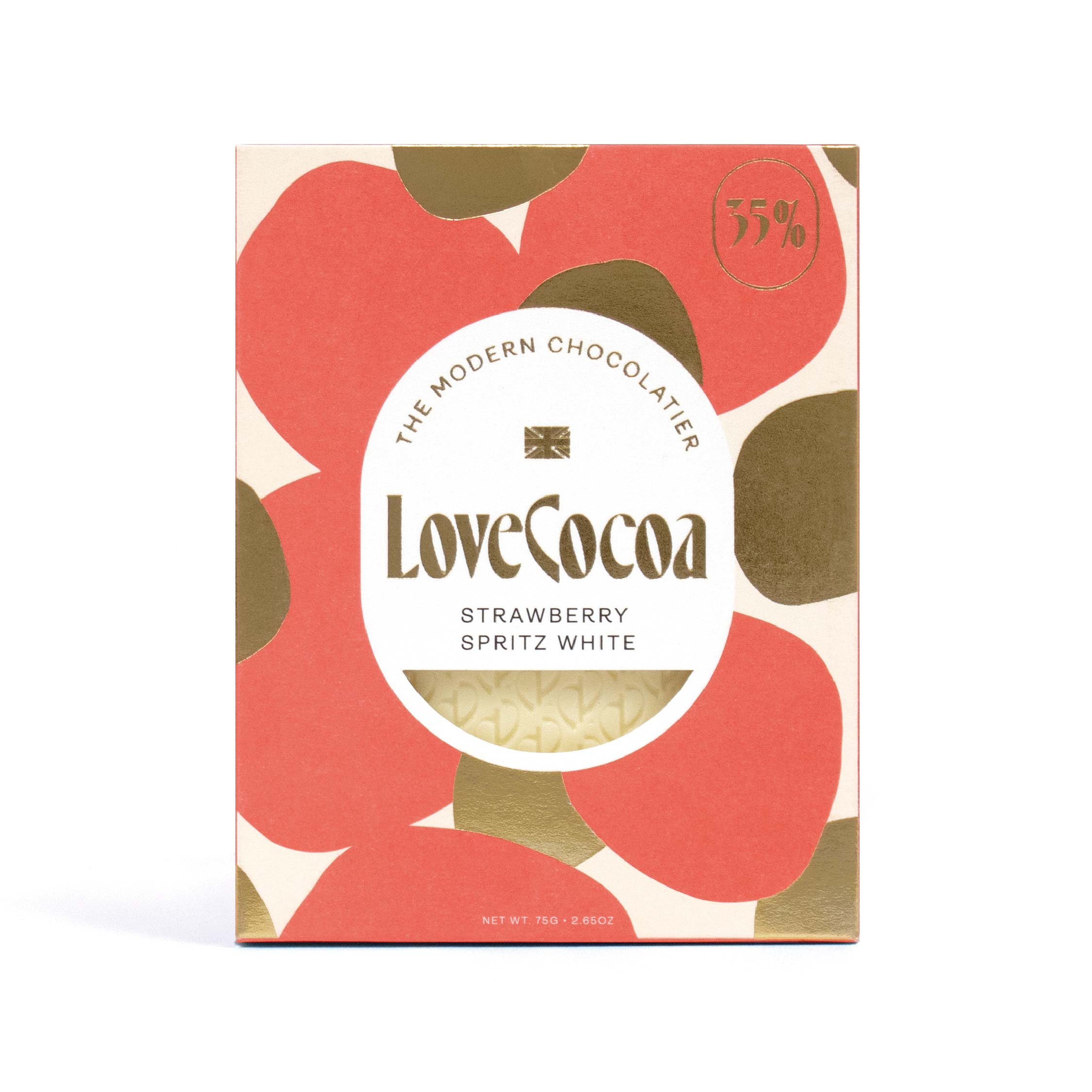 ロンドンで立ち上げたチョコレートブランド「LOVE COCOA(ラブココア)」。上質なホワイトチョコレートに、フリーズドライストロベリーとシャンパンオイルを加えた、高級感ある大人のホワイトチョコレート。華やかなパッケージでギフトにもぴったりです。