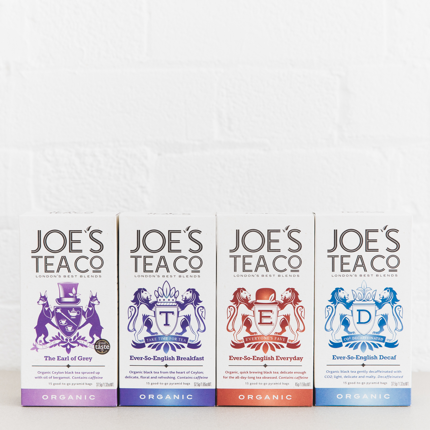 ロンドンで誕生したオーガニックティーブランド「JOE'S TEA(ジョーズティー)」。フローラルで爽やかな紅茶“Ever-So-English Breakfast”、まろやかでベーシックな“Ever-So-English Everyday”、環境にも身体にも配慮した“Decaf”、香り高い“The Earl of Grey”の4種をご用意しました。