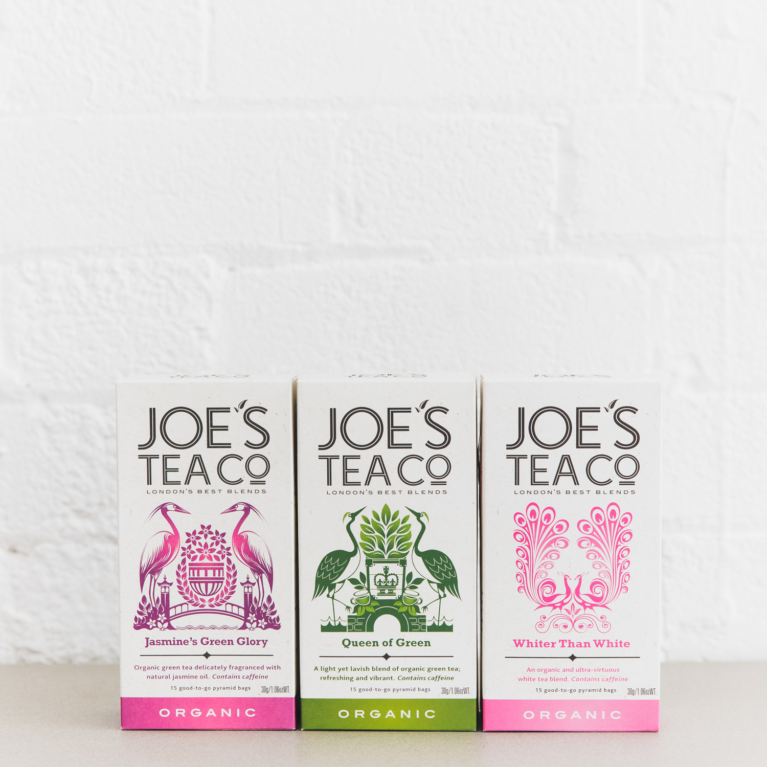 ロンドンで誕生したオーガニックティーブランド「JOE'S TEA(ジョーズティー)」。日本人にも愛される“Queen of Green”、上質で奥深い香りの“Jasmine's Green Glory”、緑茶よりも深みがある“Whiter Than White”の3種類をご用意しました。
