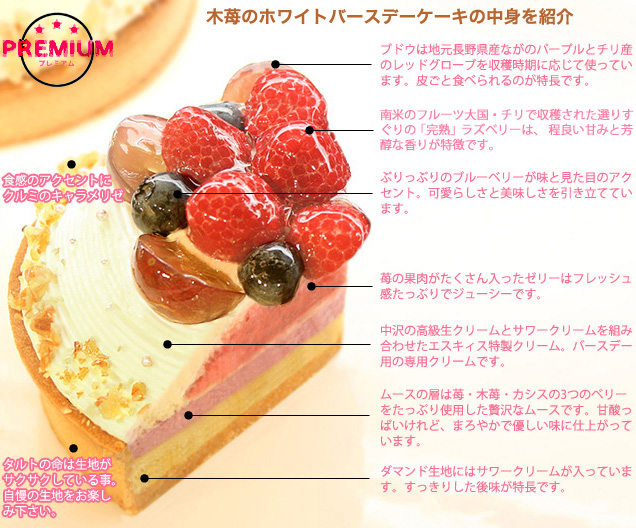 | 原材料 | 小麦粉,卵,バター,砂糖,牛乳,ピューレ,アーモンドプードル,ゼラチン,生クリーム,サワークリーム,はちみつ,苺,木苺,ぶどう,アラザン,くるみ |