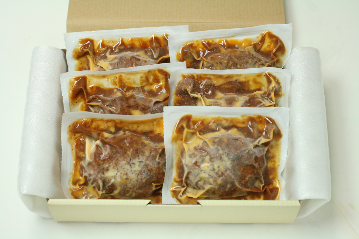 肉汁の旨味たっぷりのオリジナルデミグラスソースがかかったハンバーグです。お野菜や付け合わせにお好きなワインを合わせれば、お家で気軽にレストラン気分をお楽しみいただけます。個包装の6個入りなので、色々な食べ方をご堪能ください。