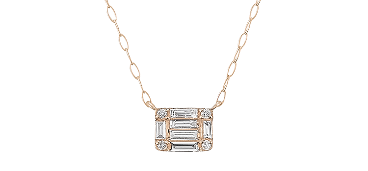 長方形のシルエットがシャープで洗練された雰囲気のネックレスです。ピンクゴールドの優しい色合いと洗練されたダイヤモンドの煌めきに思わずうっとり。他の人とは少し違うデザインが欲しいという方におすすめです。大切な方の誕生日に、記念日の贈り物にいかがでしょうか?