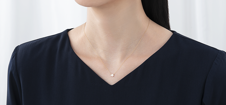 大口注文・法人のお問い合わせはこちら長方形のシルエットがシャープで洗練された雰囲気のネックレスは、落ち着きのある輝きでデコルテを上品に彩ります。ラウンドブリリアントカットはすでにお持ちの方や、他の人とは少し違うデザインが欲しいという方におすすめです。