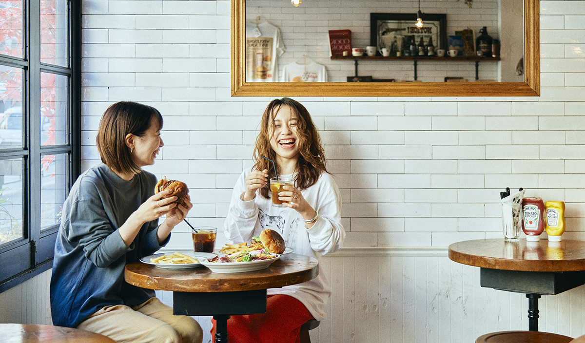 気軽に楽しめるのもバーガーショップの魅力。予約は不要で、ランチにもディナーにも、店舗によってはテイクアウトにも利用できます。1人でたっぷり食べても、誰かを誘って一緒に楽しむこともできます。