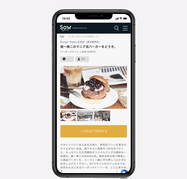 みんなに愛される身近な食べ物、ハンバーガー。日本全国に数多くのチェーン店がある中で、1つのハンバーガーに丹精を込める、手づくりのお店もあります。このチケットで味わえるのは、そんなお店で提供されるとっておきのハンバーガーです。関東と関西を中心に、ソウ・エクスペリエンスがセレクトした店舗の中から、好きなお店を選び3,000円分の食事に利用できます。