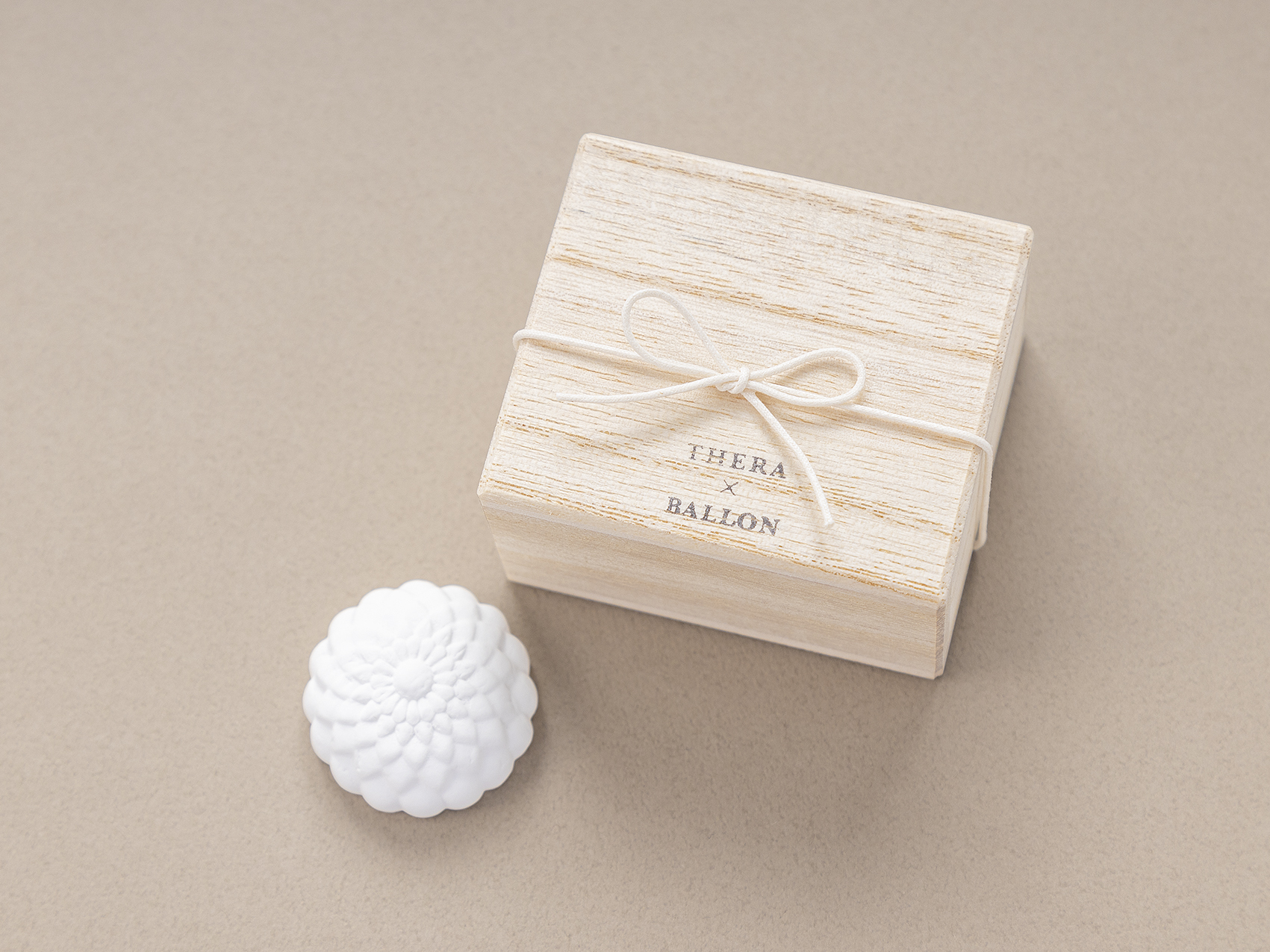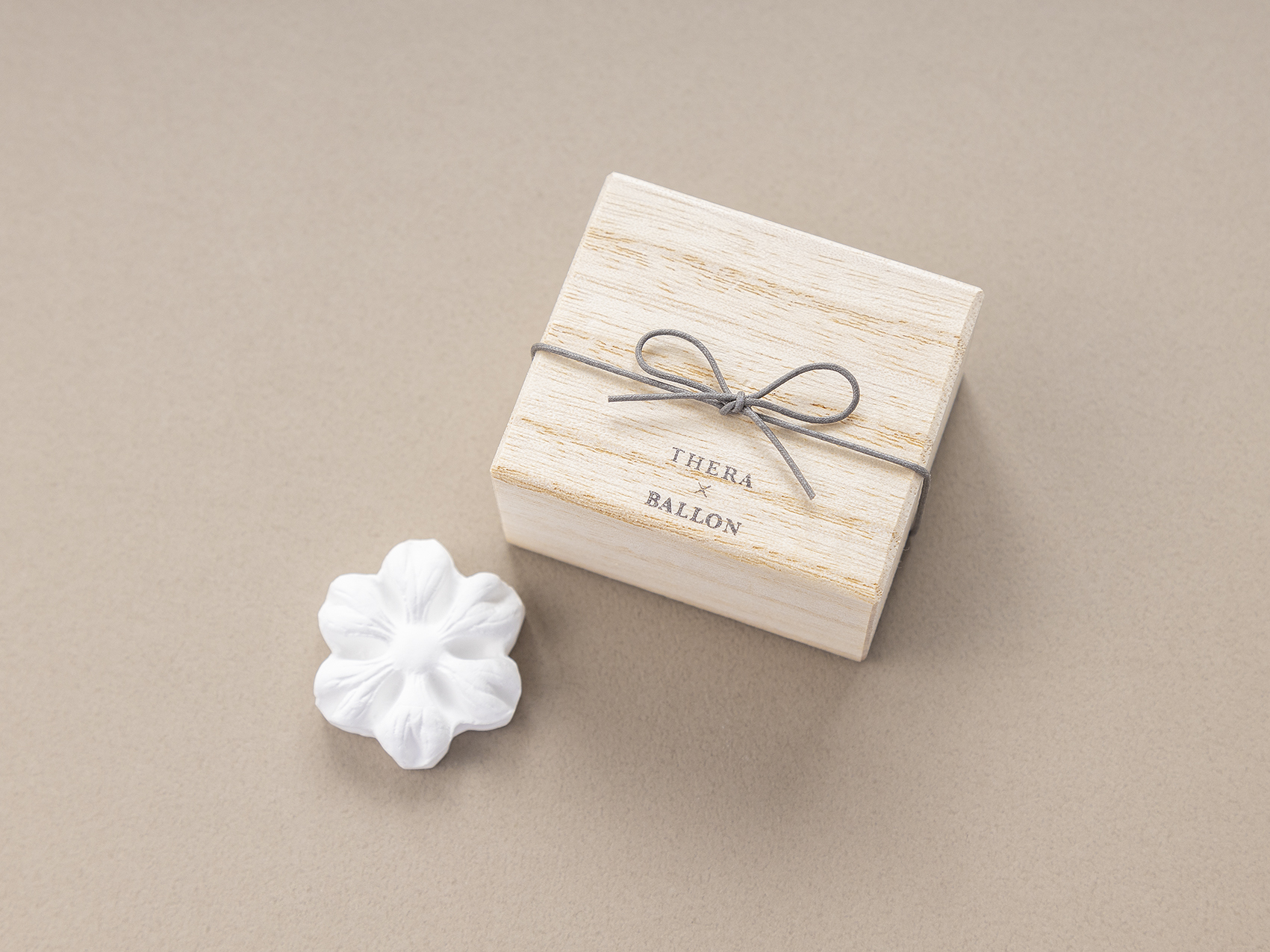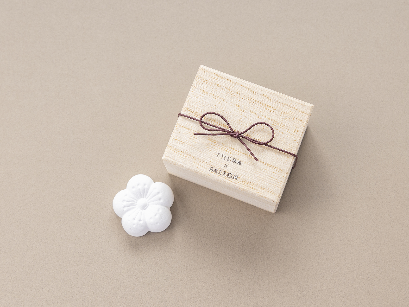 THERA x BALLONのコラボギフトです。日本の健康美容、ハーブ、漢方、アロマから生まれた奈良のブランド「THERA(テラ)」の火を使わず気軽にアロマを愉しめる石こうのディフューザーをお届け。和菓子の様な和の植物のかたち、何度でも使える(香りを変更できます)、インテリアのアクセントに。