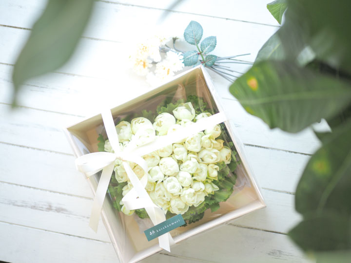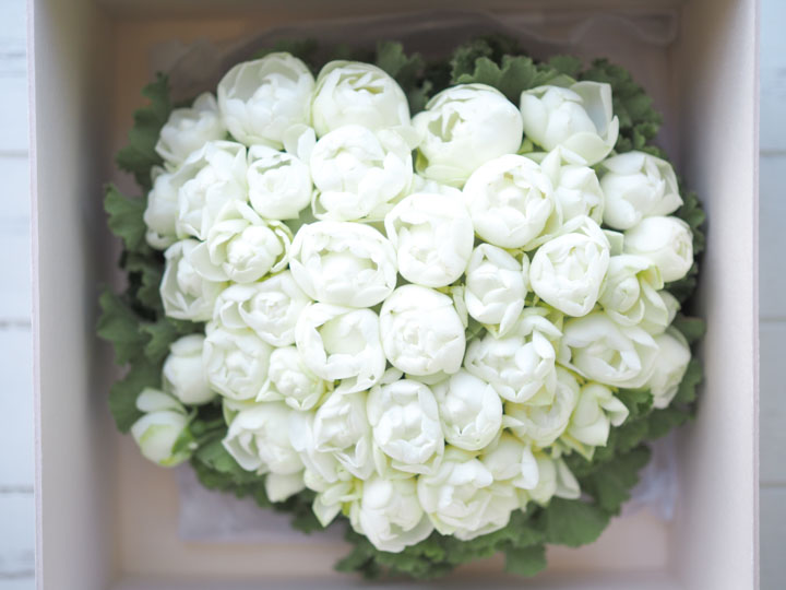 ハート型にデコレーションした真っ白なバラのアレンジメントです。甘くて優しい気持ちを届けてくれるような素敵なアレンジメントになっています。専用ボックスに入れてお届けするのでプレゼントにもおすすめです。特に女性の方に喜んでいただけるはず!