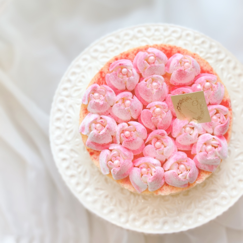 美しいバラはランジェラ特製の、くちどけなめらかな自慢の生クリームで作られています。コクのあるKiriを使用し、粉をほとんど使わないので、濃厚で大満足な食べ応えです。バラの中央のパールが華やかな印象ですね。厳選した素材のみ使い、着色料不使用で安心安全なお菓子を作っています。