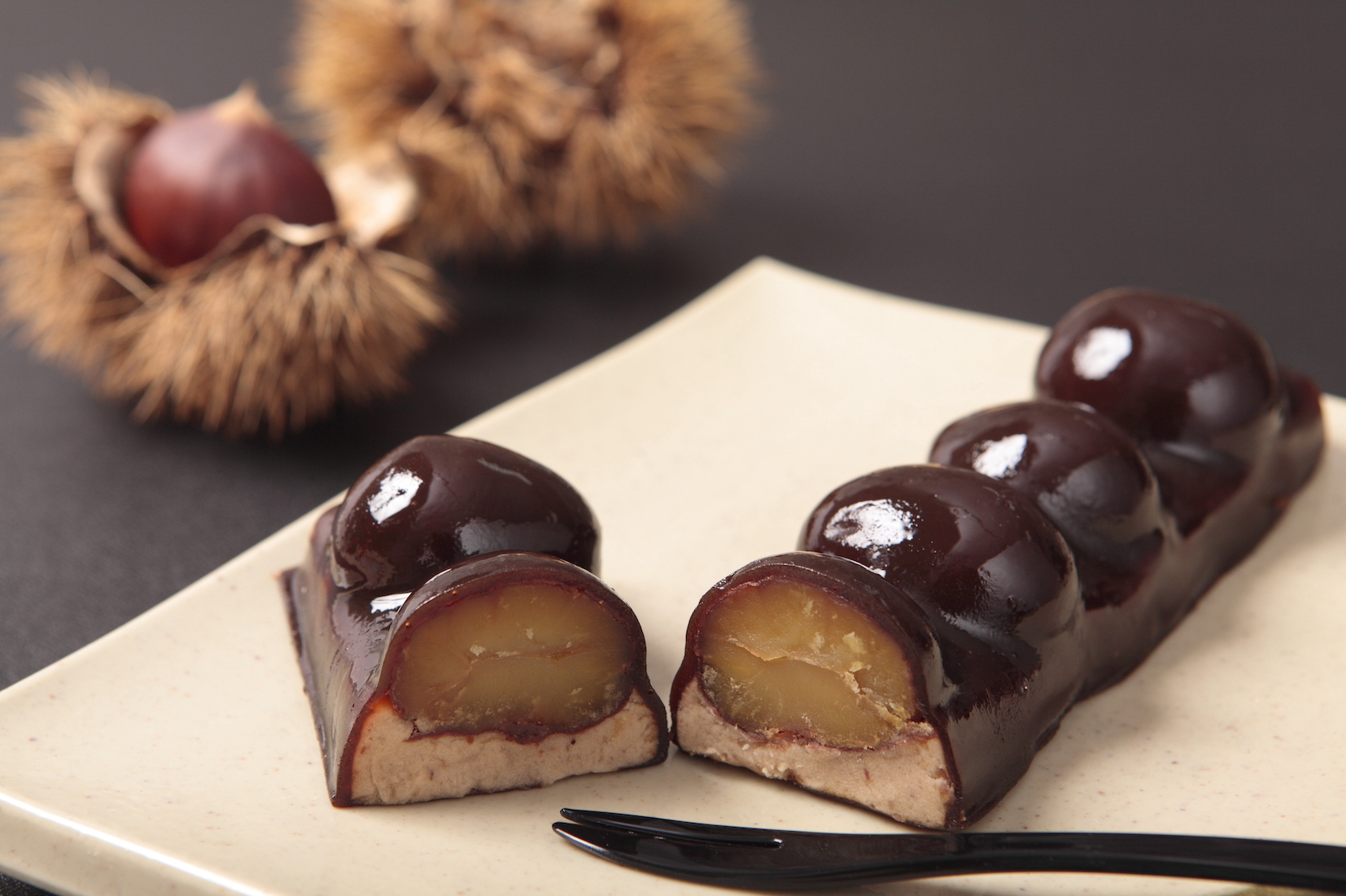 大口注文・法人のお問い合わせはこちら宮崎県美郷町にある地元の栗和洋菓子店から継承した当店人気の商品。国産の栗餡に栗の渋皮煮を丸ごとのせ、黒糖羊羹で上掛けしました。栗本来の風味と優しい甘みを活かすよう黒糖羊羹は甘さを控えました。 5粒の大栗をのせ、カットしたときのきれいな断面も売りとしていますのでお客様のお手元でも簡単に美しくカットできるよう、黒糖羊羹の上掛けには手間をかけ丁寧に作業しています。見た目にも贅沢でこだわった上品なお菓子です。