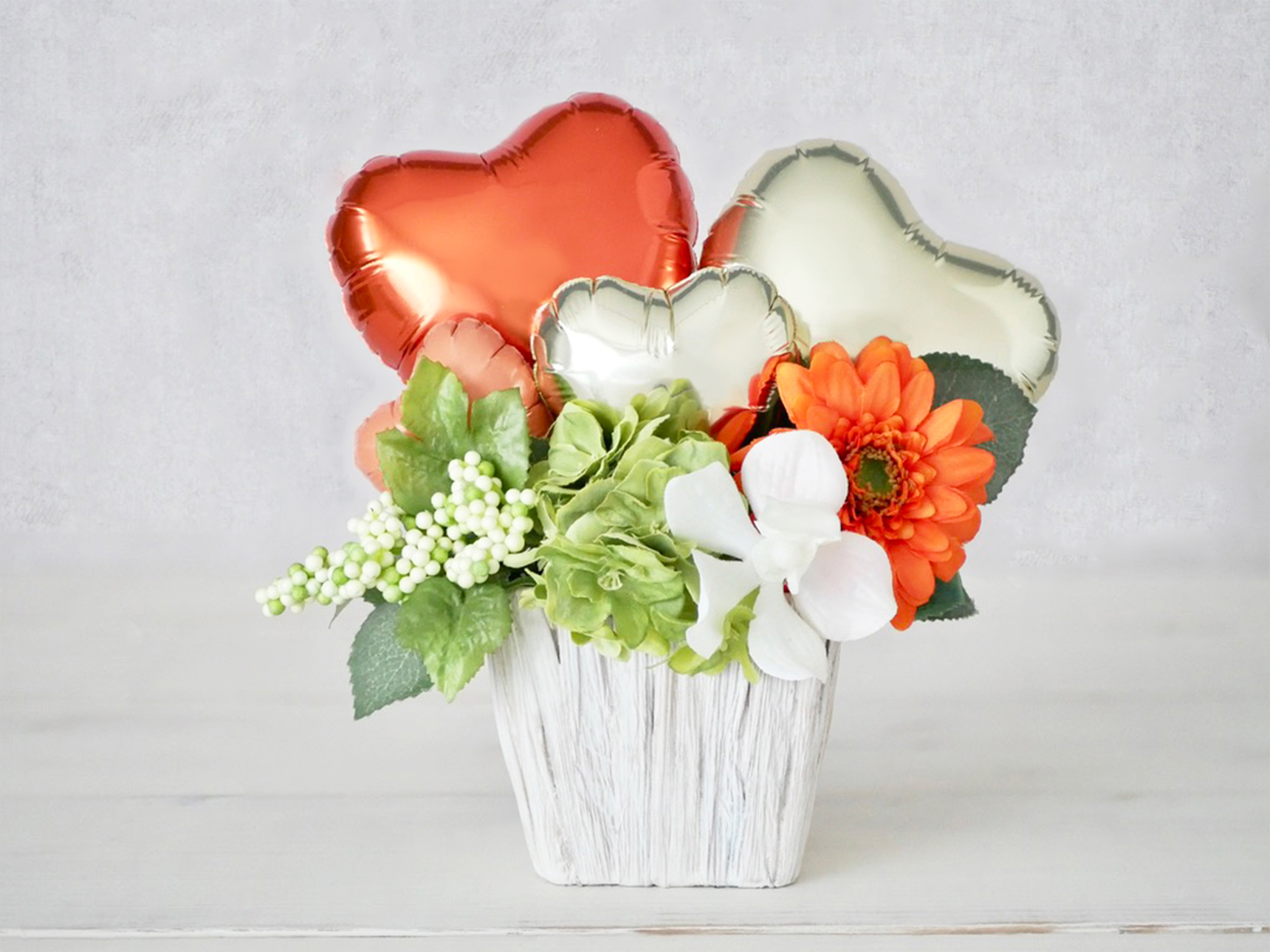 大口注文・法人のお問い合わせはこちらバルーンと、品質の高いアーティフィシャルフラワーをたっぷり使用したキュートなミニアレンジメントシリーズ。オレンジ色のバルーンと、ホワイトとグリーンのフラワーの取り合わせが、フレッシュでエレガントです。 バースデーなどのサプライズ以外に、サンキューギフトとしても活躍します。 ※持ち時間、見栄え時間の目安:3ヶ月程度です。(※環境により変わります。)