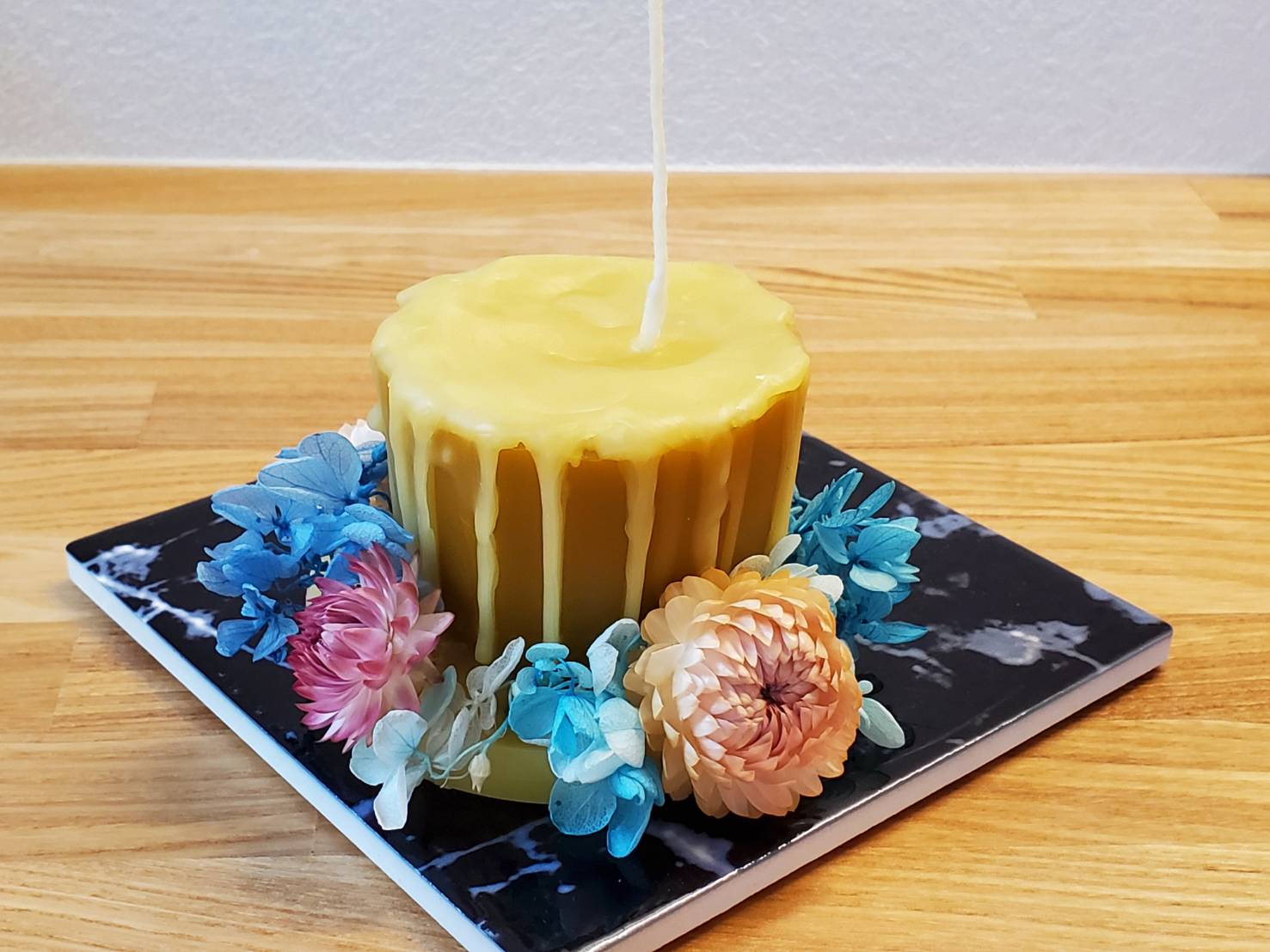 南国宮崎で生まれ、生活や空間を彩るインテリアを提供している「美空間コーディネート協会」の蜜ろうドリップケーキキャンドルです。天然蜜ろうを精製していく中で生まれる色の濃淡を生かし、ケーキとクリームの部分の色を変えています。甘いハチミツの香りも楽しめます。