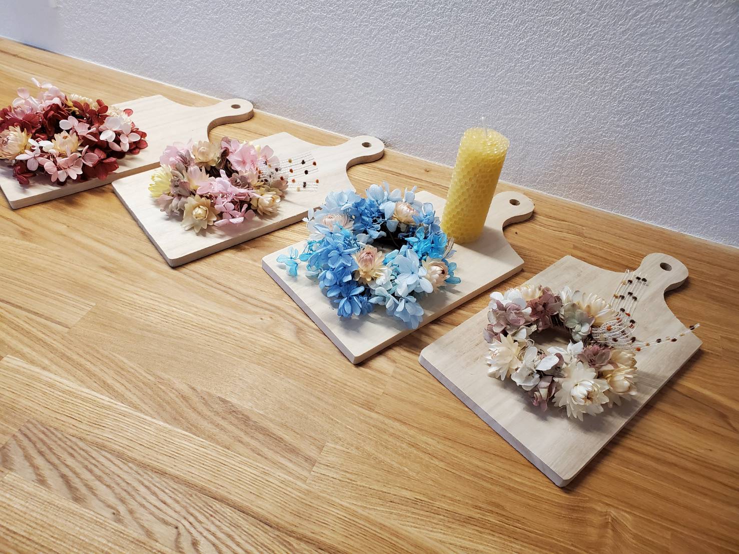 幅広い世代の方に好評をいただいていますが、北欧雑貨が好きな40代の女性に人気です。カッティングボードのお花の輪にロールキャンドルを入れて飾るだけでなく、ボードは壁掛けにしたり、ロールキャンドルは単品で置いたりとお好みの飾り方でお楽しみいただけます。
