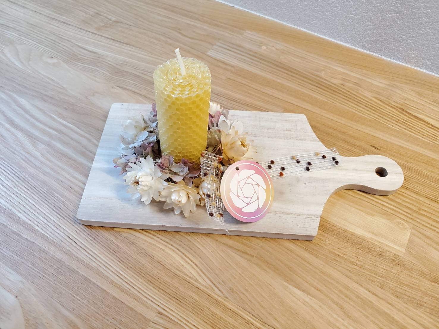 南国宮崎で生まれ、生活や空間を彩るインテリアを提供している「美空間コーディネート協会」のカッティングボード&ロールキャンドルです。桐のカッティングボードにドライフラワーとプリザーブドフラワーをあしらいました。その中央にキャンドルを置いてお楽しみいただけます。