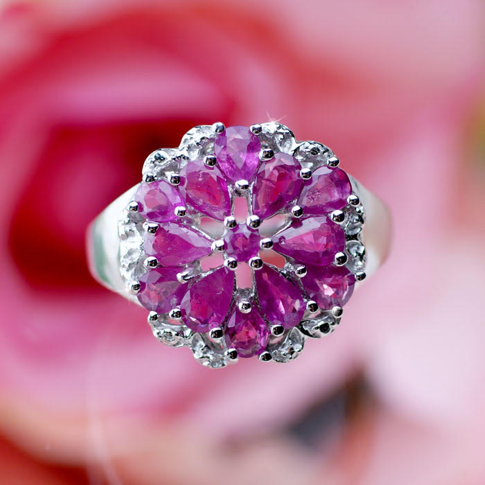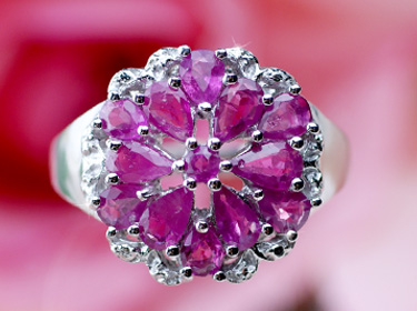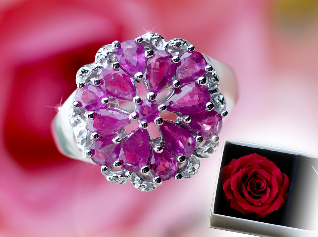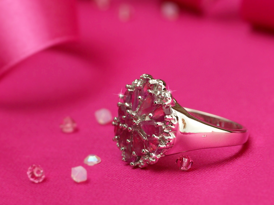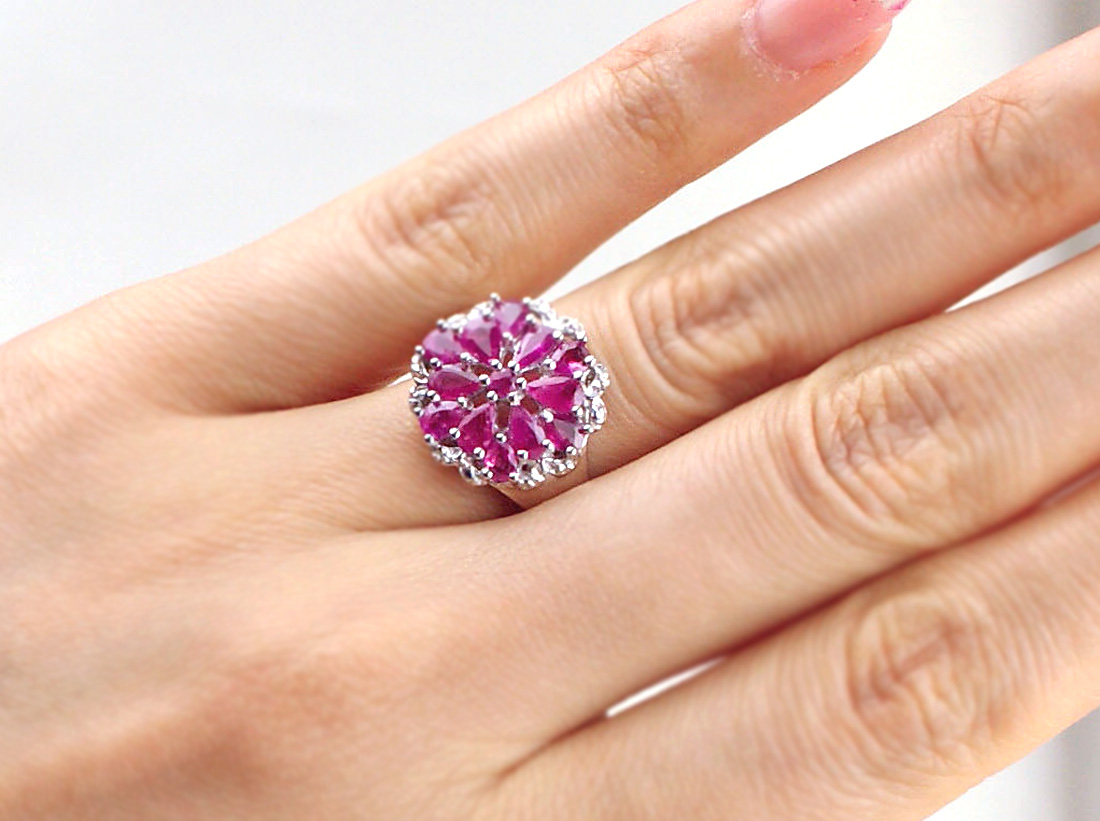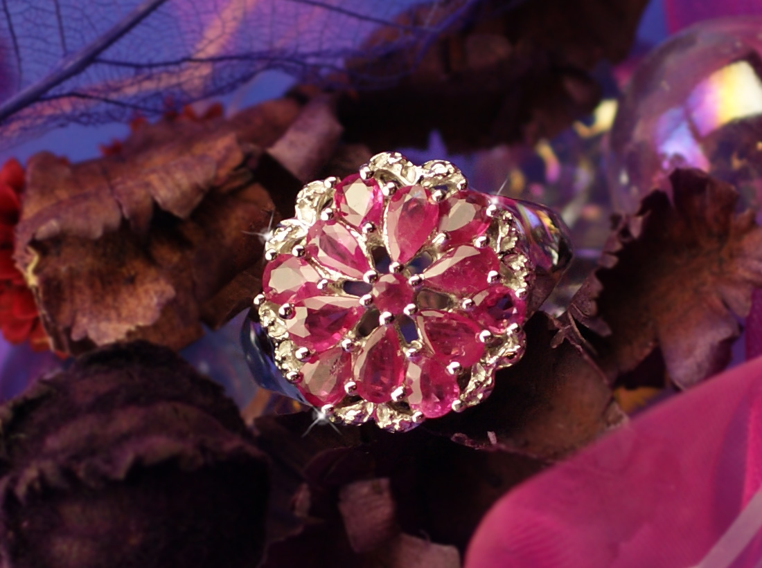 大口注文・法人のお問い合わせはこちらヨーロッパのセレブに大人気の大き目のカクテルリング。タイ産のピンクレッドに輝くルビーを贅沢に使い、まるで大輪の華が咲き乱れるように贅沢に飾り付けました。