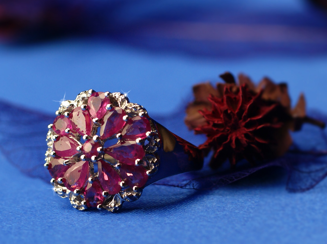 身につけているだけでパッと目を引くような豪華なデザインを目指して生まれたリングです。大き目のルビーで作られたフラワーモチーフが指先をほっそり見せてくれます。