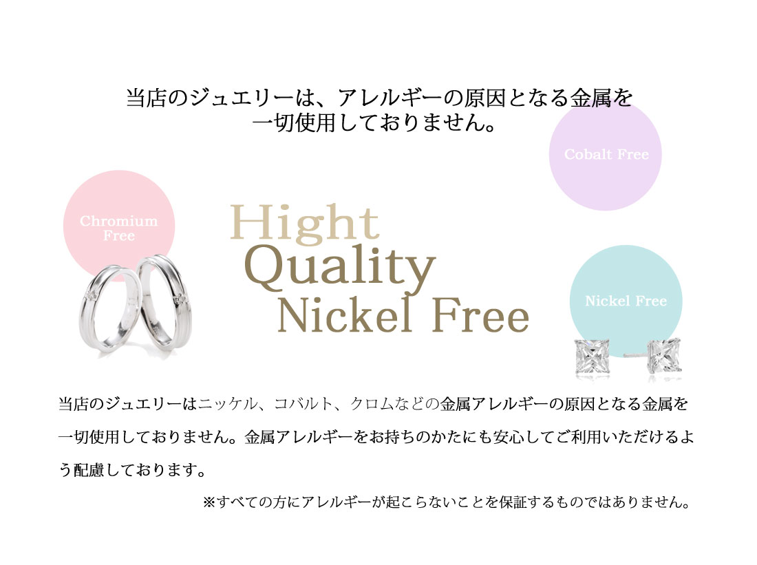 クレメンティアのジュエリーはニッケル、コバルト、クロムを含まない金属アレルギー対応の商品です。 ※すべての方にアレルギーが起きないことを保証するものではありません。