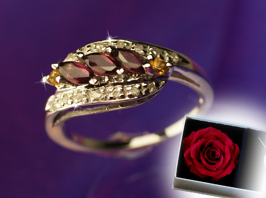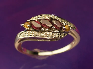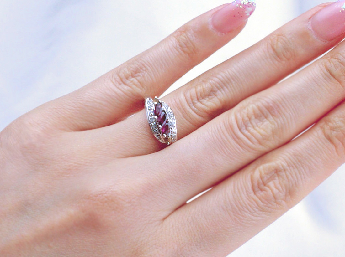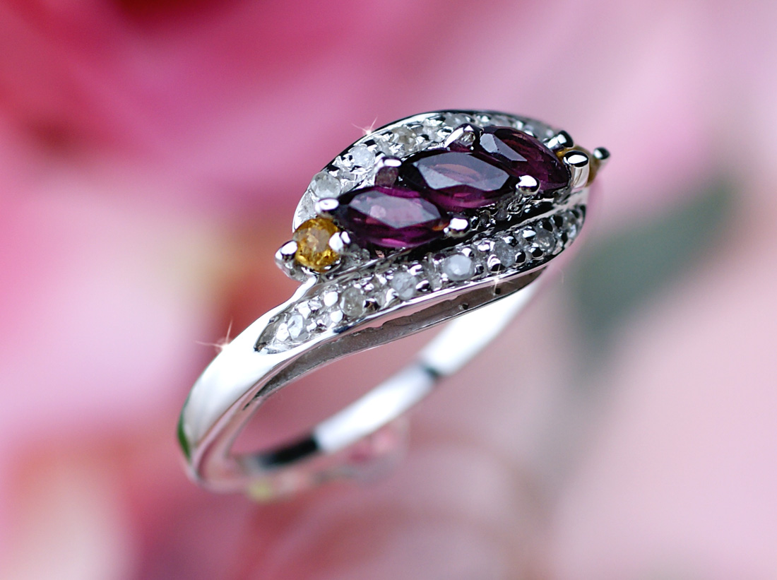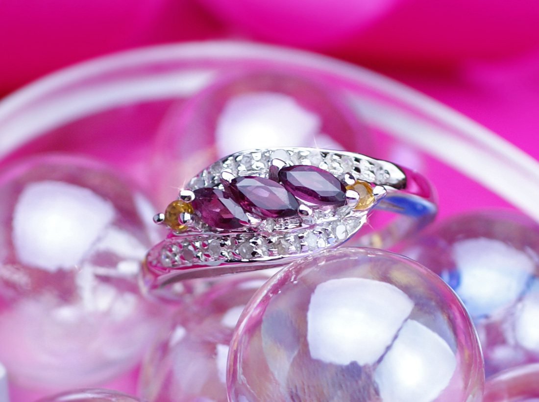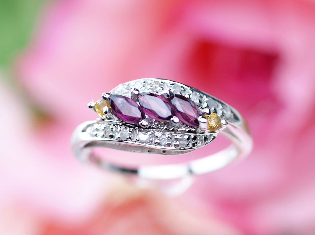 “エレガンスと自立を両立した大人の女性のためのジュエリー”をテーマに、華やかなオリジナルデザインを生み出すジュエリーブランド「Clementia(クレメンティア)」。3連のマーキスカットが美しい、ロードライト ガーネット & シトリン ファインリングです。