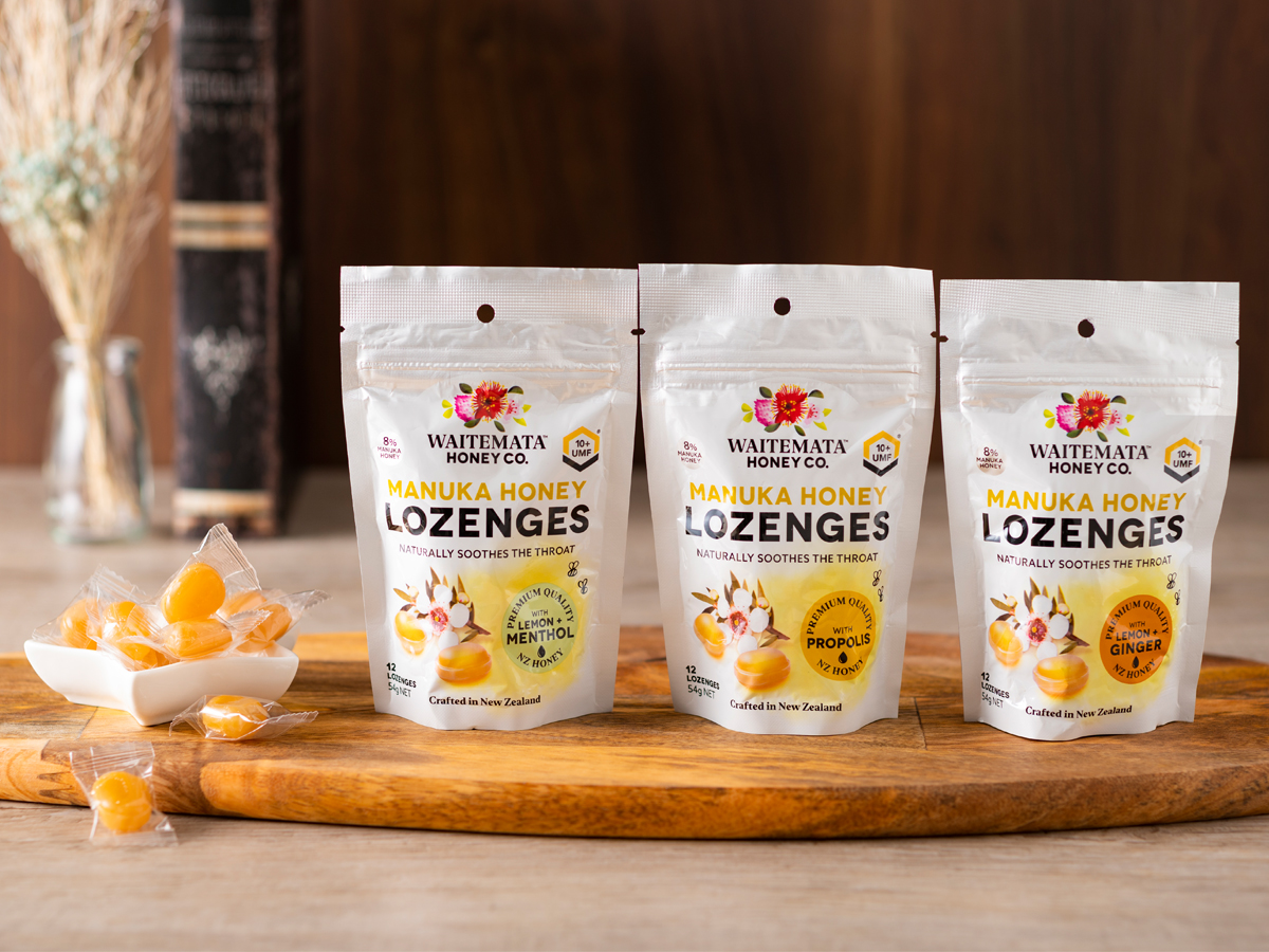 UMF10+品質のマヌカハニーを8%使用したキャンディーです。プロポリス、レモン&ジンジャー、レモン&メンソールの3種類のフレーバーを配合したキャンディ。 1粒ずつ個包装されているので持ち運びに便利です。外出先でも気軽にマヌカハニーをお召し上がりいただけます。寒くて乾燥する季節の外出のお供に!