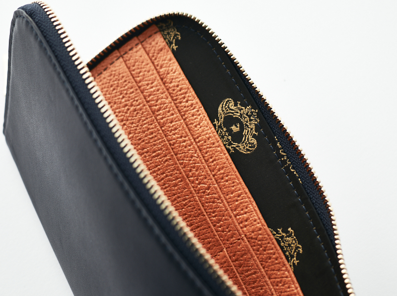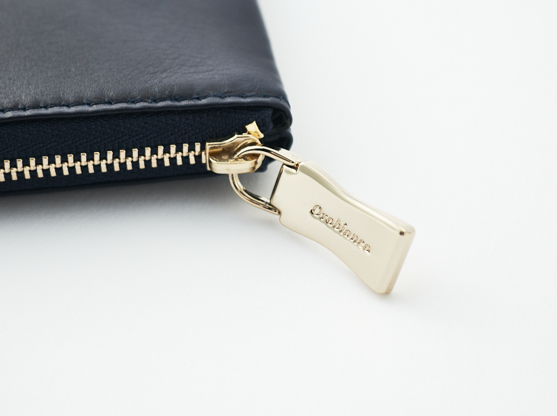 CORONA LOGO (王冠)をコーナーに焼印したシンプルなデザイン。メタル&ファスナー色は、「ORO(金)」「BIANCO(白)」 =『OROBIANCO』の、白金(薄金)メッキを付けました。