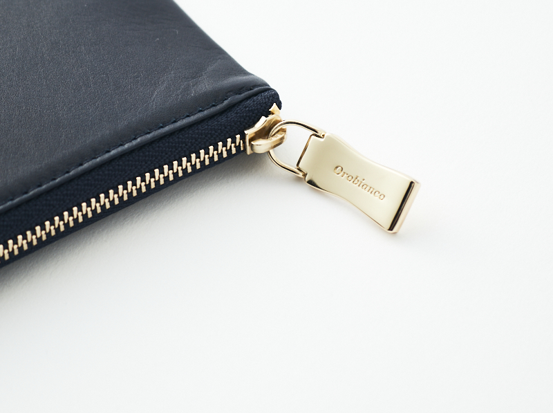 CORONA LOGO (王冠)をコーナーに焼印したシンプルなデザイン。メタル&ファスナー色は、「ORO(金)」「BIANCO(白)」 =『OROBIANCO』の、白金(薄金)メッキを付けました。
