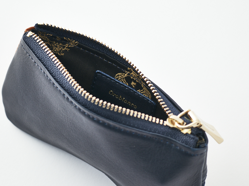 CORONA LOGO (王冠)をコーナーに焼印したシンプルなデザイン。メタル&ファスナー色は、「ORO(金)」「BIANCO(白)」 =『OROBIANCO』の、白金(薄金)メッキを付けました。