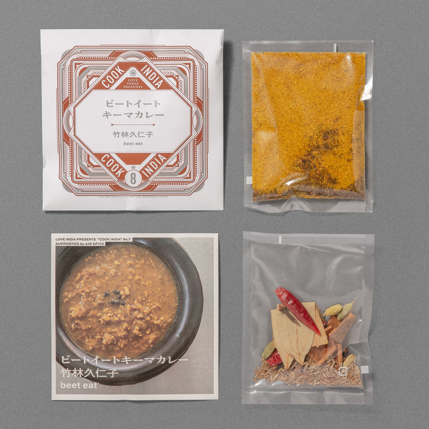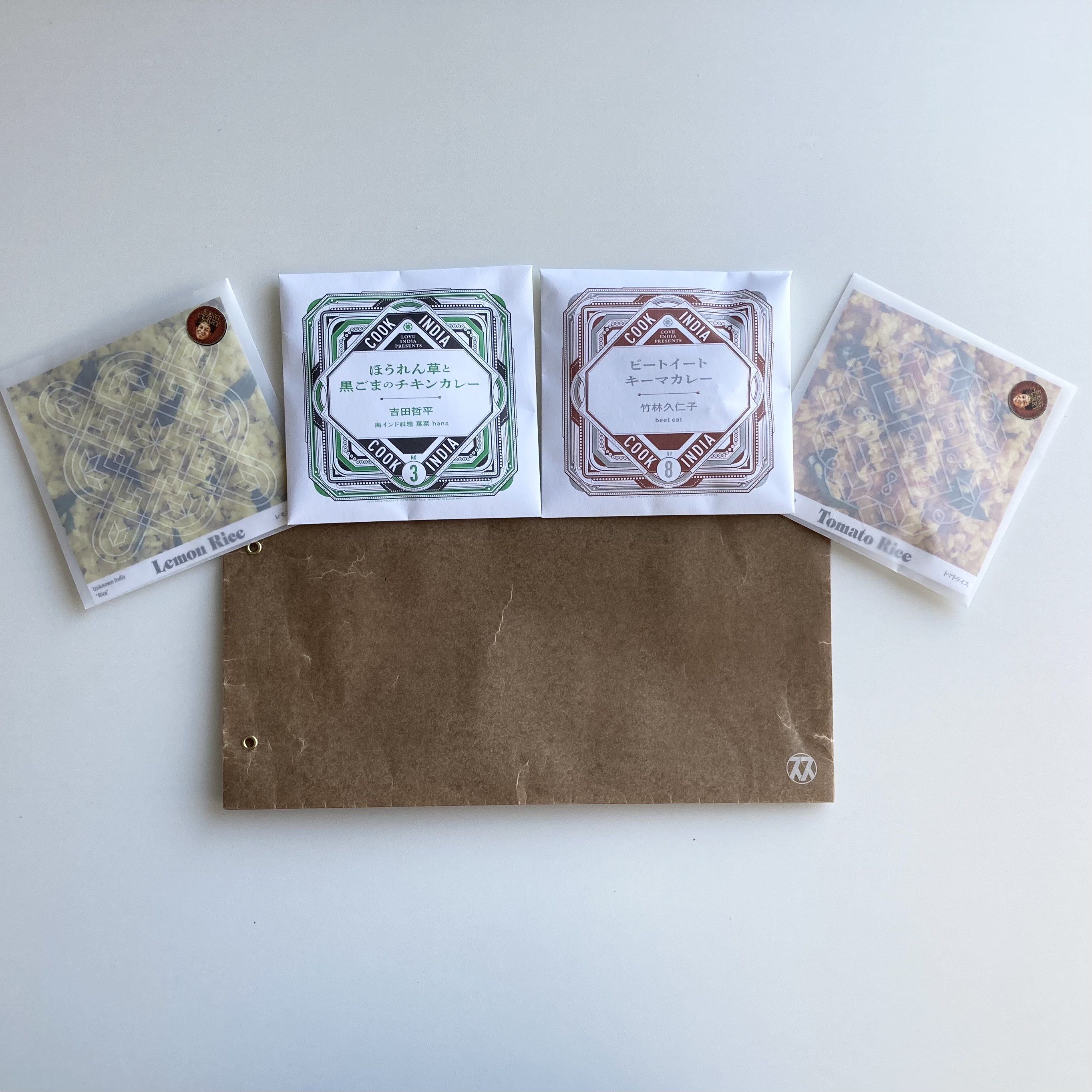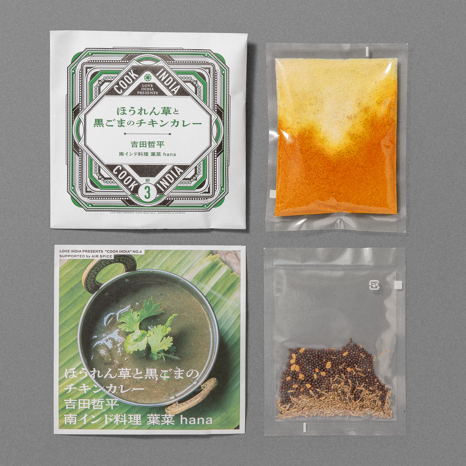| 原材料 | 【COOK INDIA03】南インド料理 葉菜 hana:吉田哲平『ほうれん草と黒ごまのチキンカレースパイスセット』 カシューナッツ(インド・アフリカ・ベトナム産混合)、コリアンダー、チリパウダー、ターメリック、マスタードシード、ガラムマサラ(クミン、ブラックペッパー、コリアンダー、カルダモン、クローブ、ナツメグ、シナモン、ショウガ、月桂樹、キャラウェイ、メース)、クミン、アジョワン、フェヌグリーク(一部にカシューナッツを含む) 【COOK INDIA08】beet eat:竹林久仁子 『ビートイートキーマカレースパイスセット』 コリアンダー(インド産)、ティムール、シナモン、クミンパウダー、クミンシード、ブラックペッパー、ガラムマサラ(クミン、ブラックペッパー、コリアンダー、カルダモン、クローブ、ナツメグ、シナモン、ショウガ、月桂樹、キャラウェイ、メース)、ターメリック、チリホール、グリーンカルダモン、クローブ、ベイリーフ、チリパウダー 【UNKNOWN INDIA #RICE】レモンライススパイスセット ウラドダール(インド産)、マスタードシード、ターメリック、チリホール 【UNKNOWN INDIA #RICE】トマトライススパイスセット ウラドダール(インド産)、フェンネル、チリパウダー、ターメリック、チリホール |