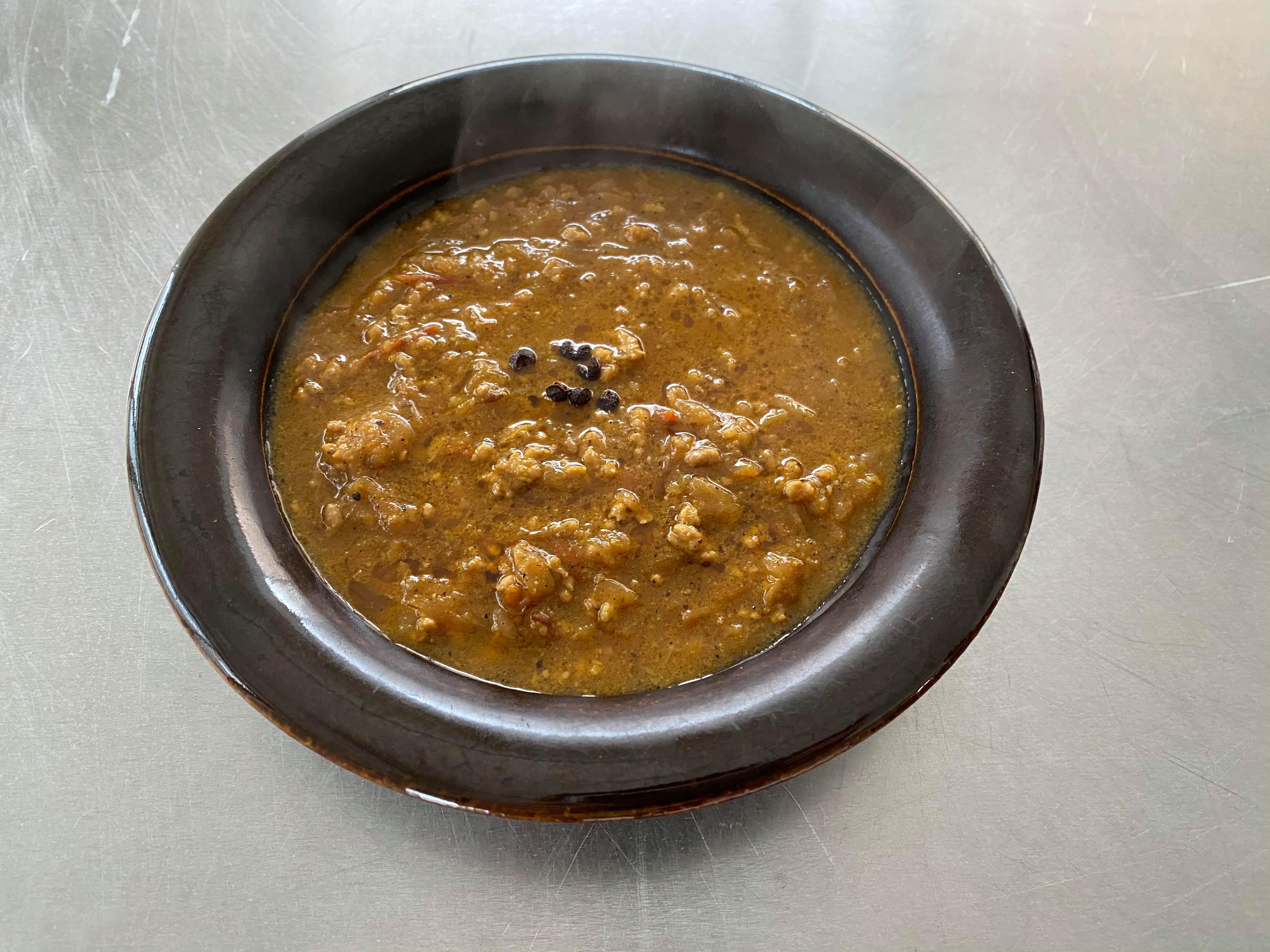 豚肉キーマカレーです。鍋に何かを入れると油が分離するまで丁寧に火をいれるという教科書のようなカレーです。調理動画では調理のポイントやレシピには書けない裏技、工程の意味を丁寧に解説してます。