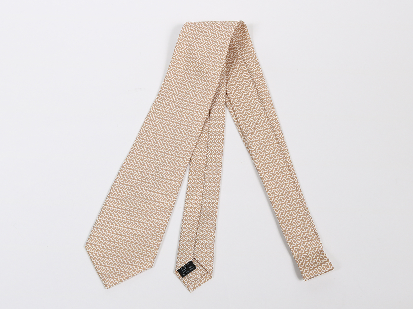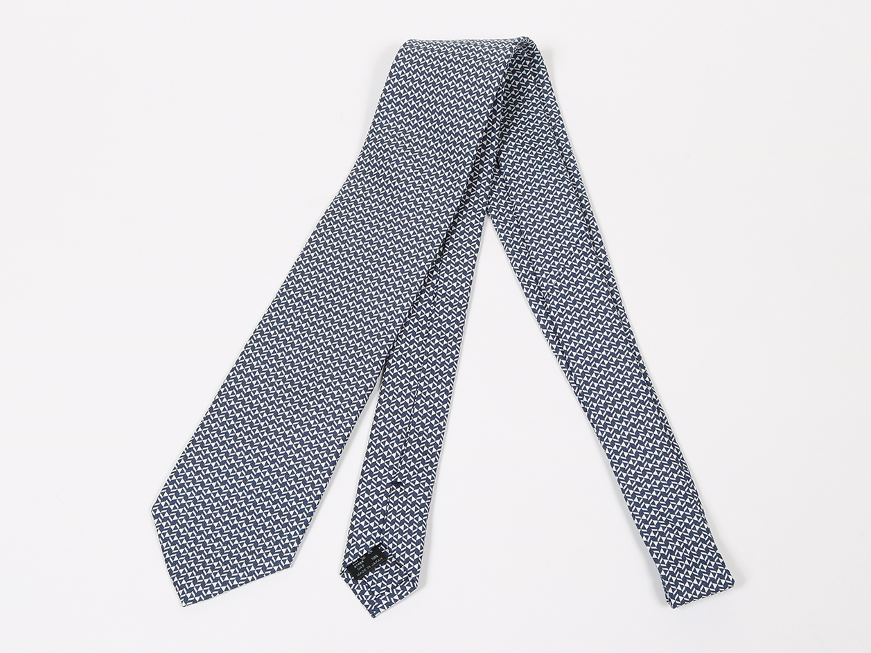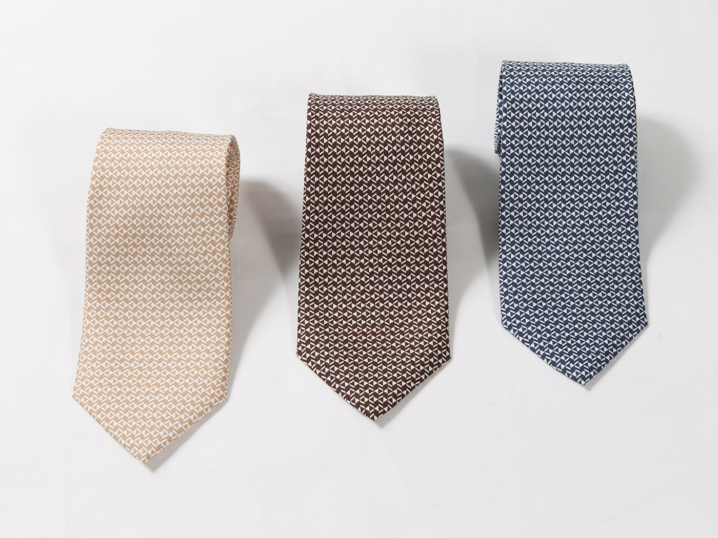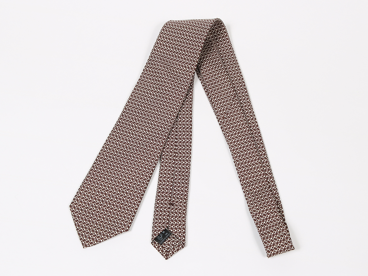 上質なシルクを贅沢に使用したネクタイは、艶やかで肌触りが良く長く愛用していただけます。細かな幾何学模様はビジネスにはもちろん、プライベートでの私服にも合わせやすいデザインです。落ち着いたカラーなので、幅広い年代の方におすすめの一本です。