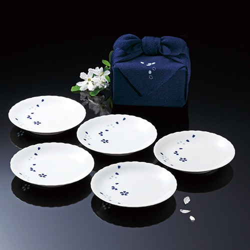 大口注文・法人のお問い合わせはこちら可憐な白磁の皿に花びらとホタルが美しく映えて。藍色の花びらにホタルという透かし技法を入れた「京都 きらら坂」の銘々皿セットです。 縁取りのフリンジが花びらとあいまって可愛らしい雰囲気。有田焼らしい伝統と今風デザインが調和された透明感のある器です。