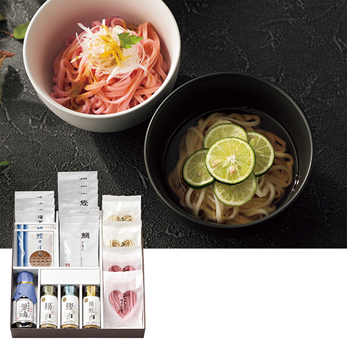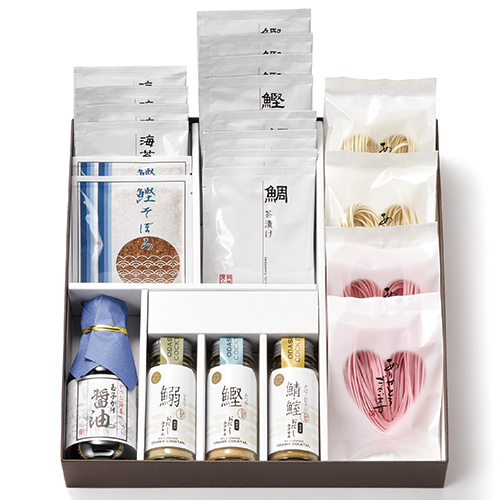 粉末だし3種にふりかけや鰹そぼろ、うどんをセットにしました。詰め合わせのボリュームもあり、ご家族みなさまでご利用いただけます。 <セット内容> 粉末だし:鰹・鯖鰘・鰯(20g)×各1 玉子かけ醤油(145ml)×1 鯛茶漬け(6g)×4 のりたまごふりかけ(3.5g)×4 かつおふりかけ(3.5g)×4 鰹そぼろ(7g)×2 ハートうどん(50g)×4