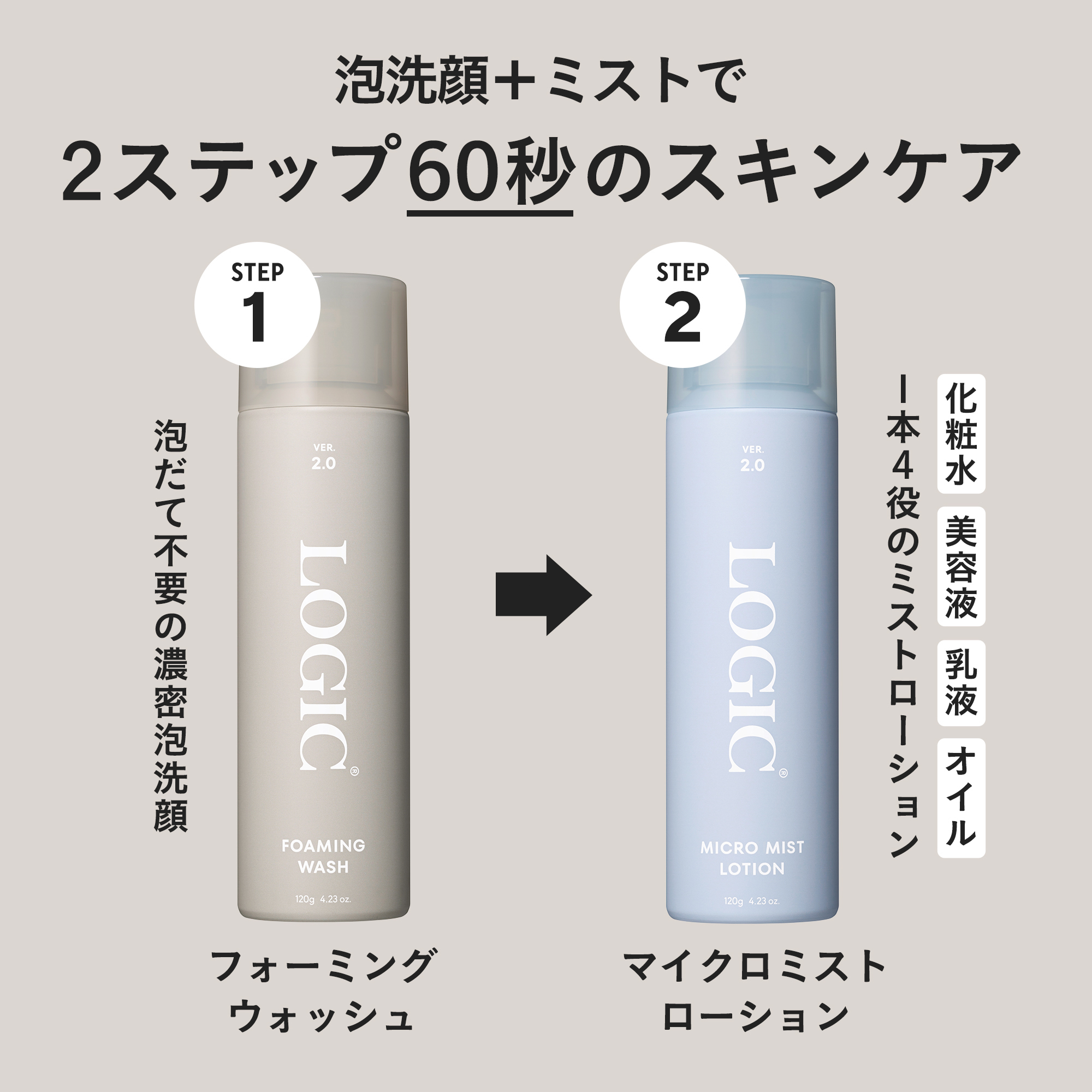 泡洗顔とミスト化粧水のたった2本で、忙しい日々に必要なケアをバランスよくカバーし、スキンケアを圧倒的に短縮することができます。 『毎日忙しくてスキンケアする時間がない、、』 『しっかりスキンケアしたいけどめんどくさくて続かない、、』 『いろいろありすぎて選べない、、』 そんな方へ【LOGIC】の圧倒的なミニマルケア体験をプレゼントしてみませんか?