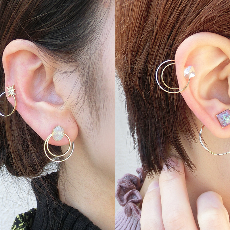 四角いデザインと、丸みのあるデザインの両面を2wayでお使いいただけます。エアカフはお好みの位置に自由に付けることができるので、耳の上下に重ね付けするとよりゴージャスな印象になります。ラウンドデザインが好きな方にもおすすめです。