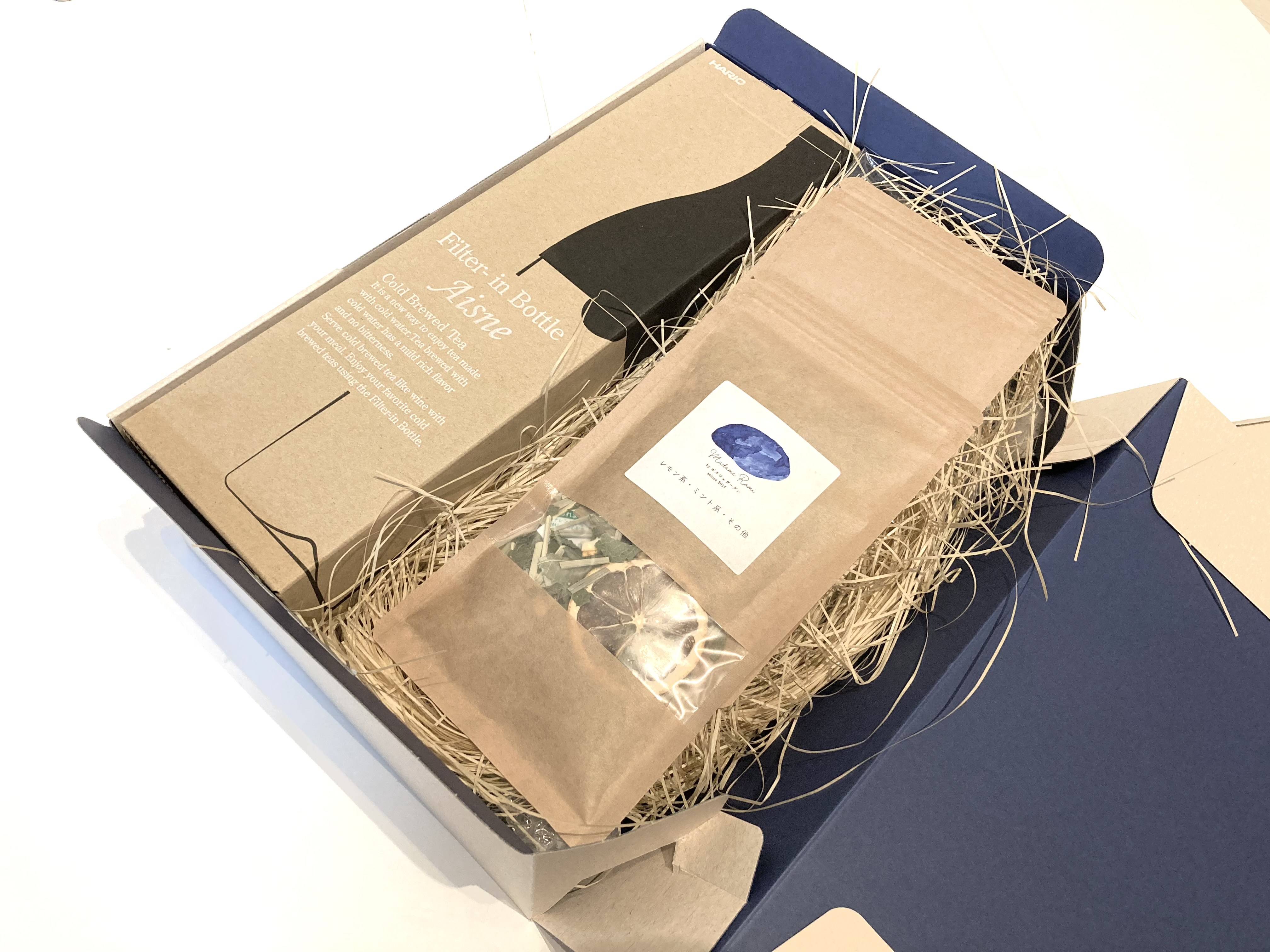HARIOのおしゃれボトルと一緒にお届けするギフトBOX。届いたらすぐにハーブティーを作れます。茶漉しが中についているので、ボトルにハーブティーをそのまま入れてお湯、水を注ぐだけで誰でも簡単にハーブティーがすぐに作れます。ダイニングに並んでいてもおしゃれな、HARIOのボトルは多くの方に喜ばれます。